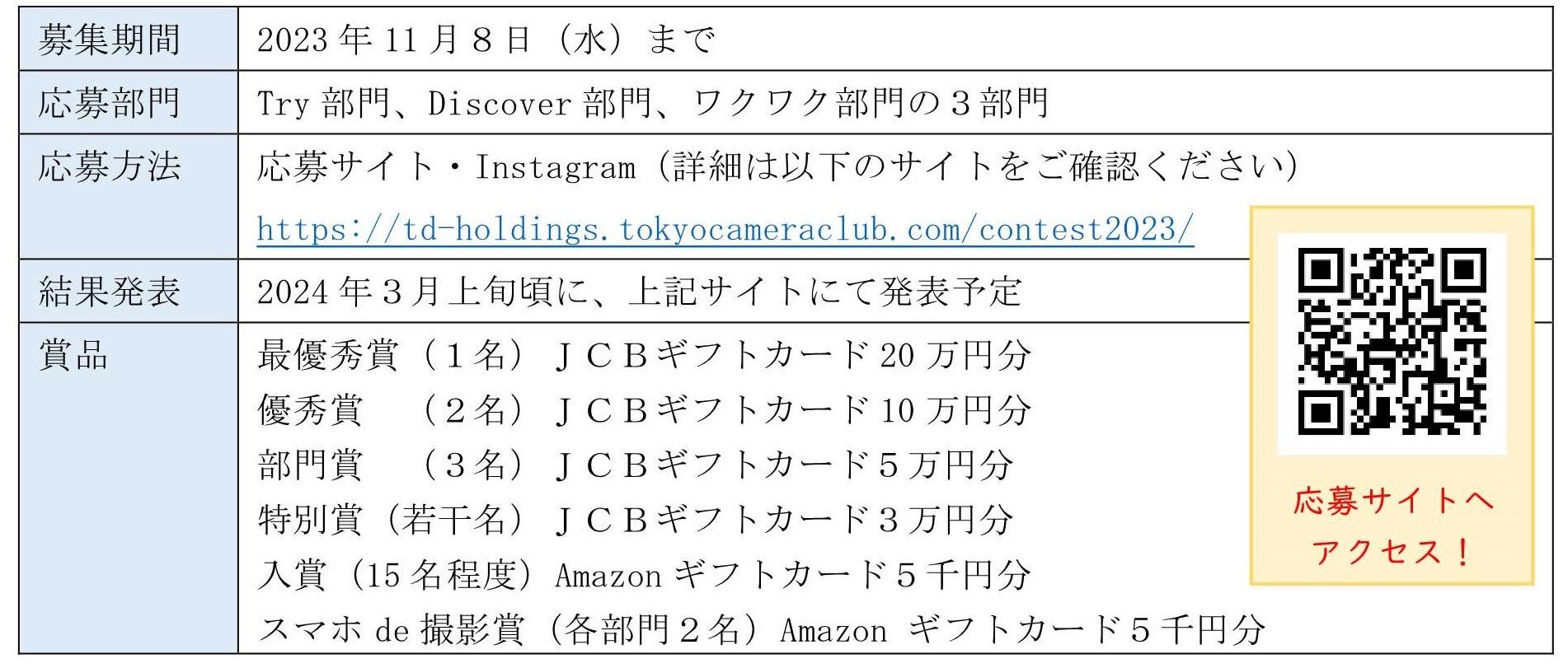 賞品 | 最優秀賞(1名)JCBギフトカード20万円分 優秀賞 (2名)JCBギフトカード10万円分 部門賞 (3名)JCBギフトカード5万円分 特別賞(若干名)JCBギフトカード3万円分 入賞(15名程度)Amazonギフトカード5千円分 スマホde撮影賞(各部門2名)Amazon ギフトカード5千円分 |