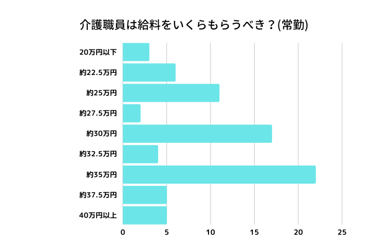 調査の結果、最も回答数が多かったのは、「約35万円」でした。次に回答数が多かったのは「約30万円」でしたので、常勤(正社員)として勤務する上で、月給30万円以上を希望する方が多いという結果になりました。