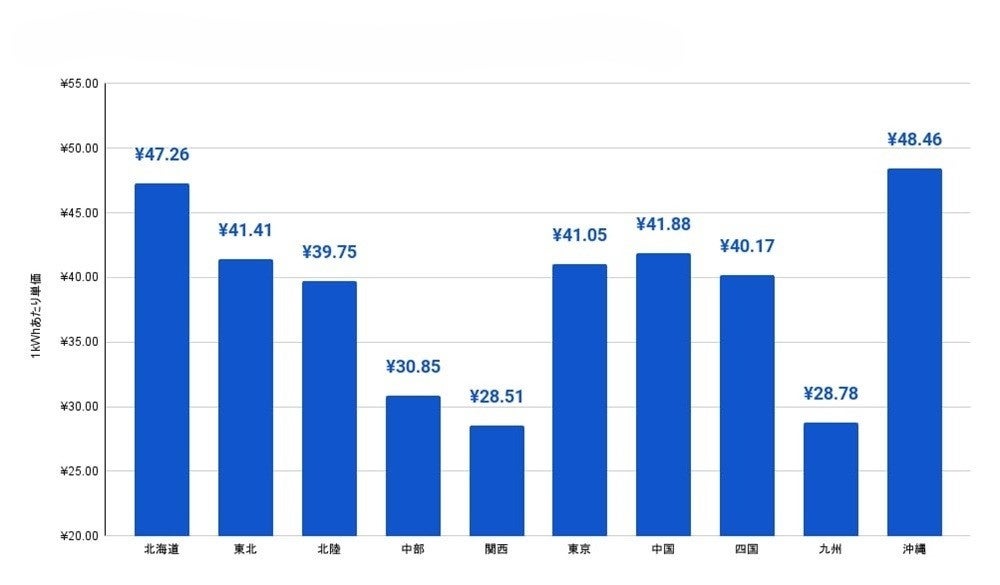 契約種別は「30アンペア(または6kVA未満)」の従量電灯A/B、月間電力使用量は「370kWh」と仮定した、2024年4月以降の電気料金の1kWhあたり単価を算出。各エリアのみなし小売電気事業者は標準モデル家庭における平均的な月間電力使用量を260kWhと定めていますが、一般財団法人省エネルギーセンターの資料および総務省統計局「家計調査 家計収支編」を基に、1世帯当たりの月間電力使用量の平均値を370kWhと定めています