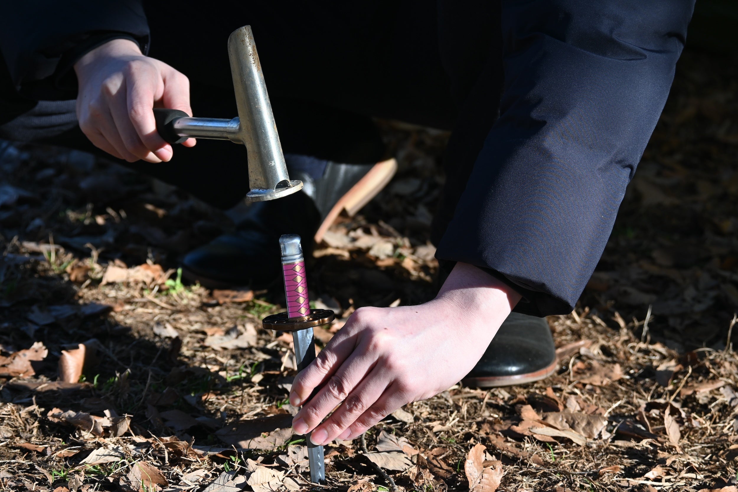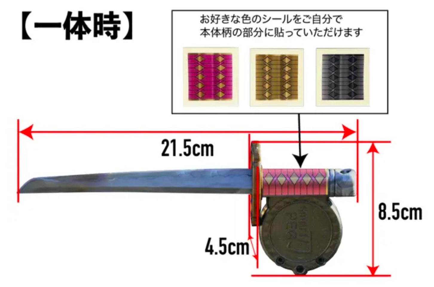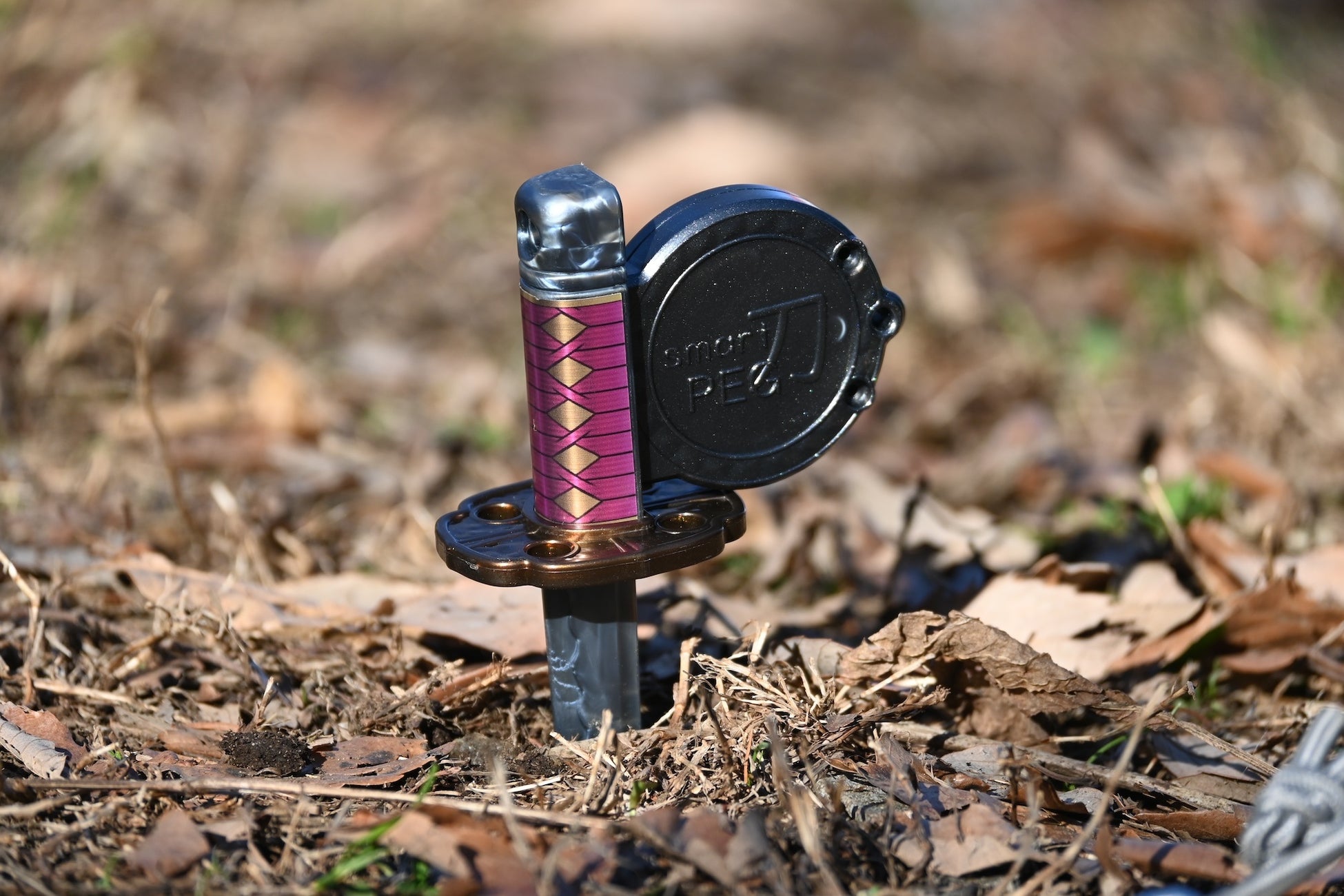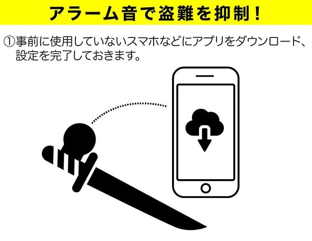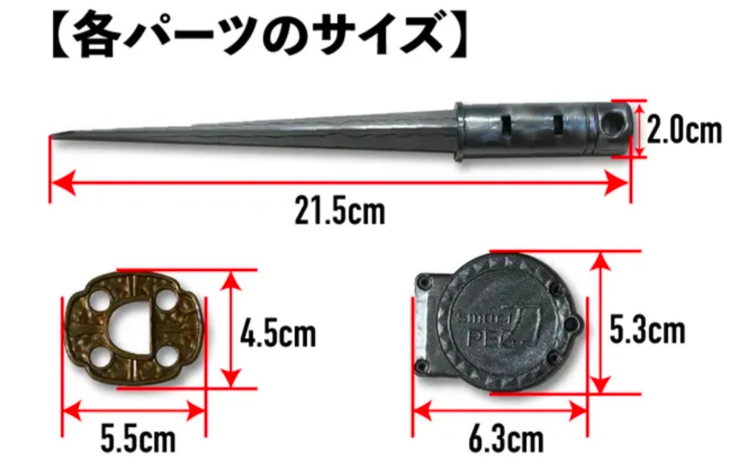 日本刀のようなデザインをしたペグに振動を検知するセンサーを搭載し、貴重品やキャンプギア・テントの入り口にワイヤーなどで接続します。