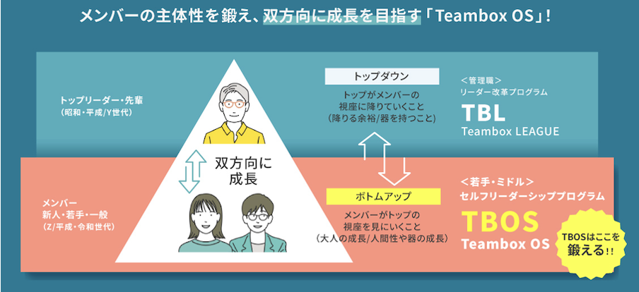 チームボックスは、企業や団体などの管理職をはじめとするリーダー育成プログラムの提供を通じて、様々な組織変革や組織文化強化等の支援を行っています。チームボックスが提供するプログラムの全てがお客様に合わせたカスタマイズで「大人が素直に学び合える場」という企業理念に基づいて設計しています。大人の学びには、アンラーンをはじめとする痛みを伴いますが、私たちは、どんな時代や社会の変化あっても人は必ず成長すると信じるYET MINDと共に、最後の最後まで大人の成長に寄り添い続ける会社です。