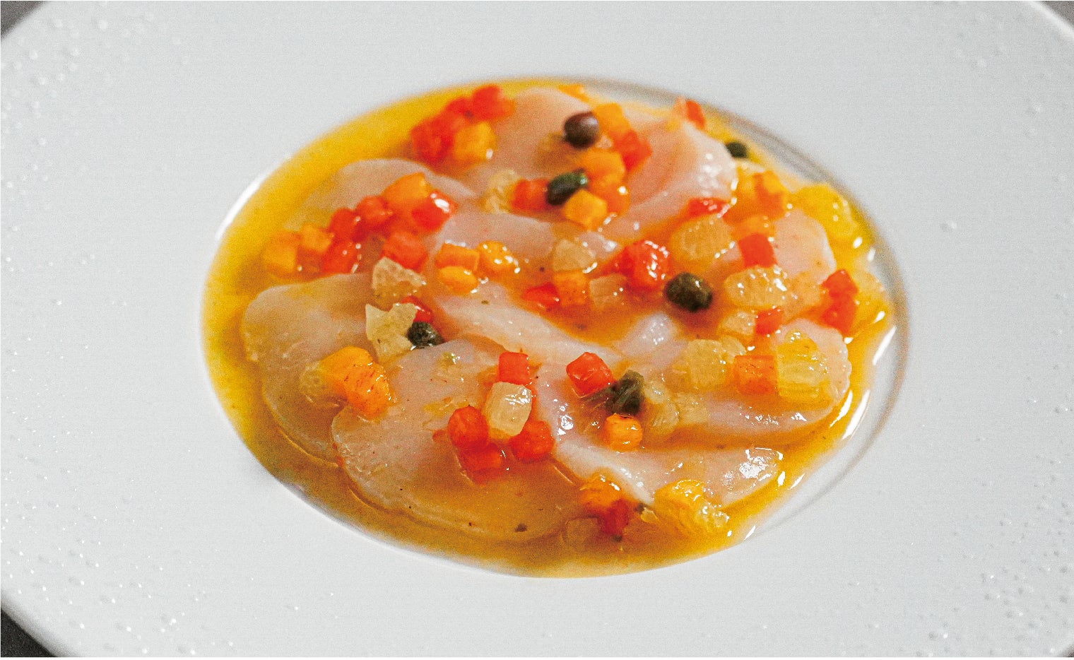 ホタテのオレンジカルパッチョ 旬の柿と柑橘のソース