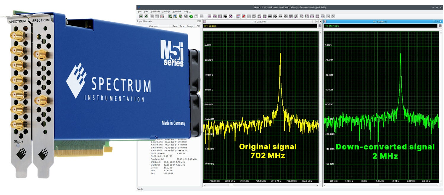 図1:スペクトラム社のM5iデジタイザカードと、DDC処理前・処理後の702MHz信号の周波数領域を示すスクリーンショット。データは、GPUに毎秒12.8GBで連続的にストリーミングされ、オンザフライ処理されたのち、スペクトラム社の計測ソフトウェア「SBench 6」に表示される。