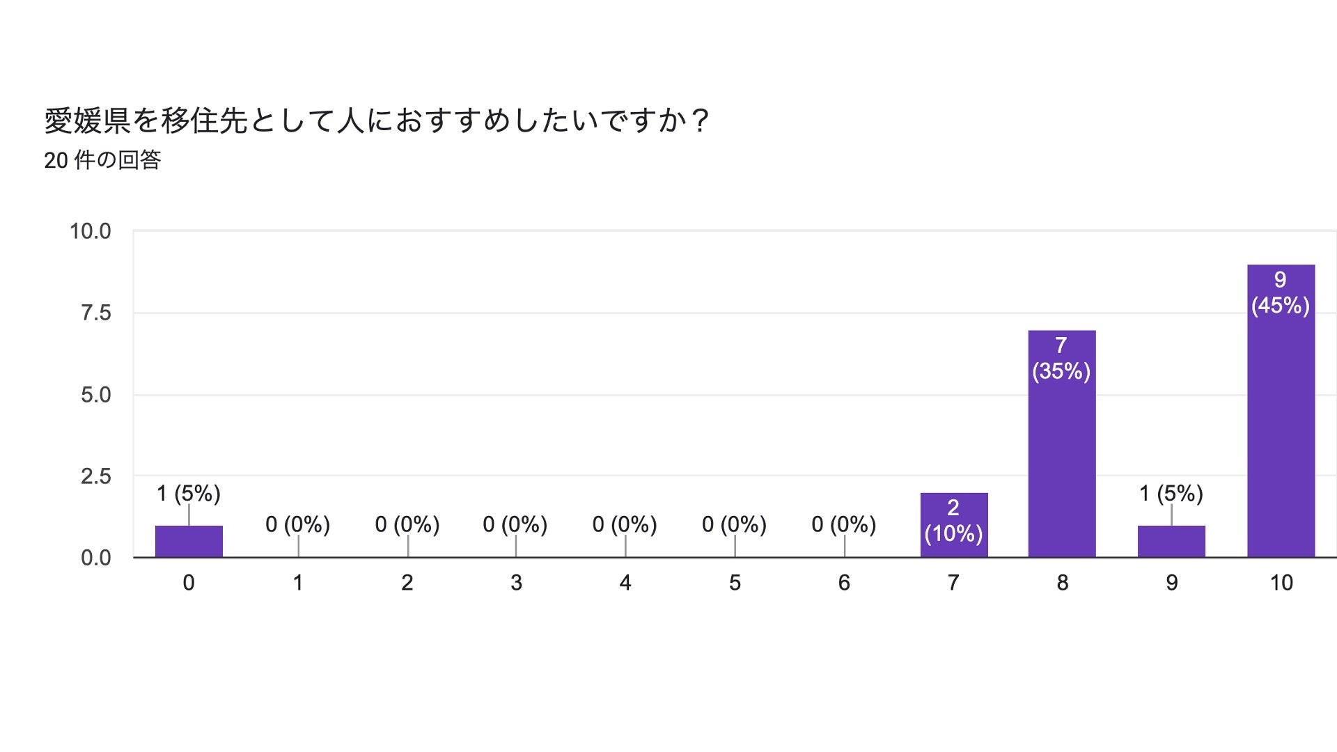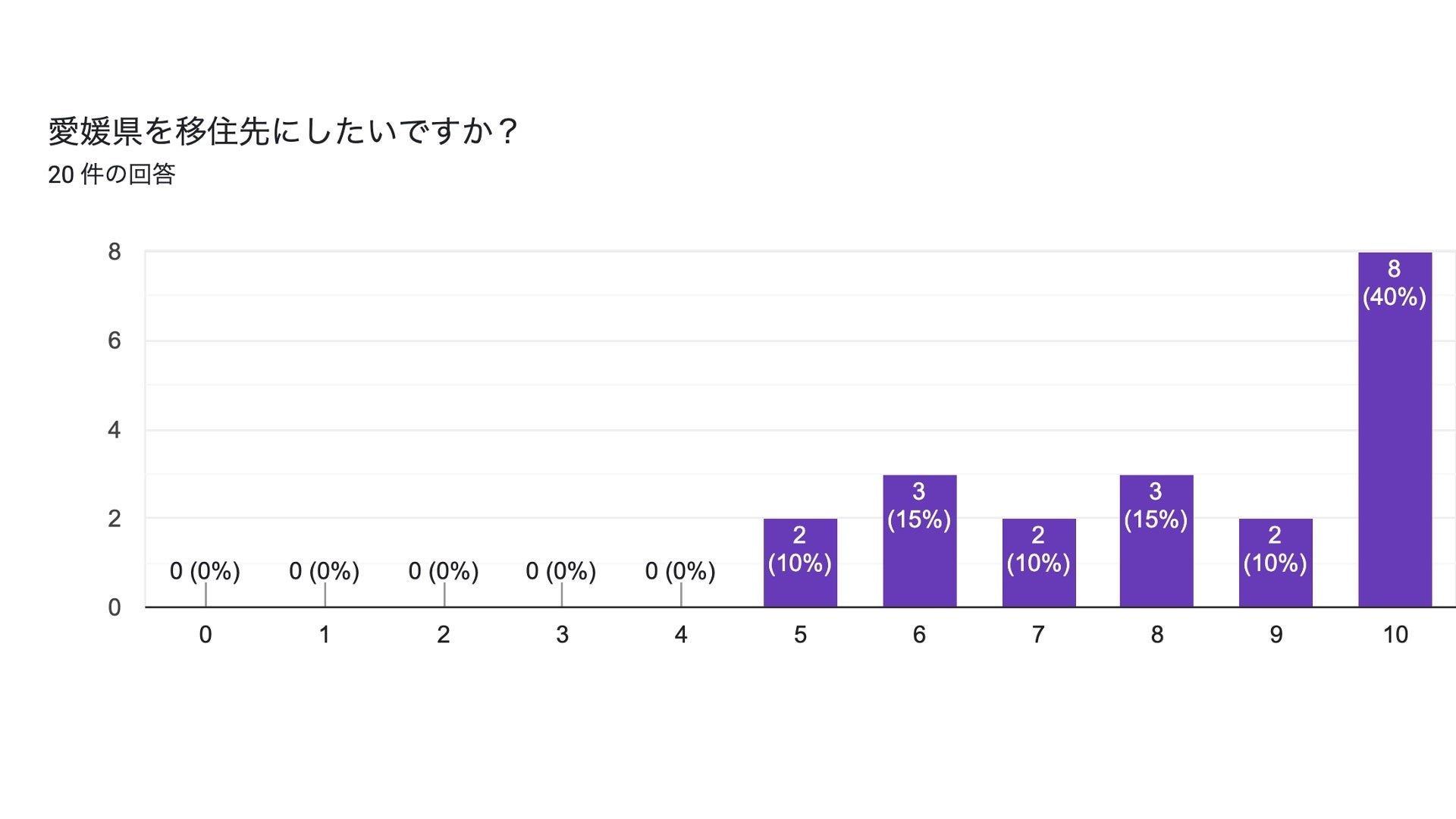 「愛媛県を移住先として人におすすめしたいか」という質問に対しては、85%の参加者が10段階中8〜10を選択し、「愛媛県を移住先にしたいか」という質問に対しては、65%の参加者が10段階中8〜10を選択しました。