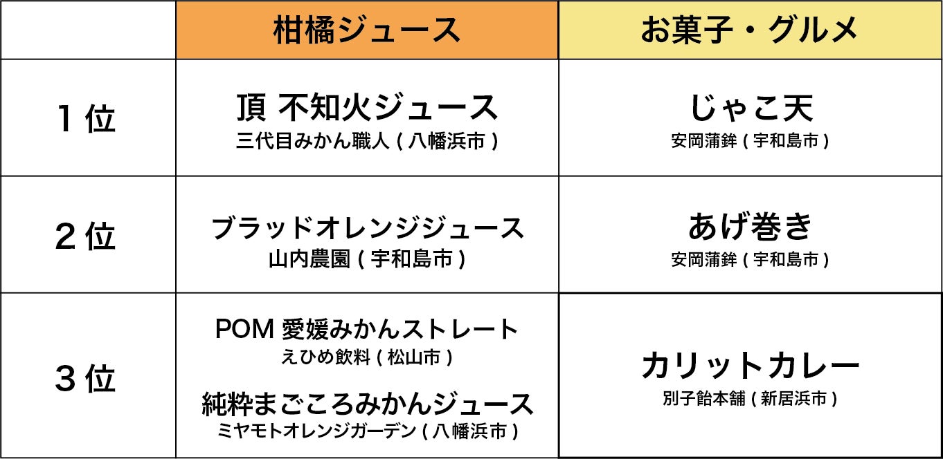 その他にも、スタッフが厳選した愛媛の柑橘ジュースの飲み比べと、愛媛のお菓子・グルメの食べ比べも行い、それぞれ参加者が気に入ったジュースとグルメの上位3位を聞きました。柑橘ジュースの一番人気は「不知火ジュース」、お菓子・グルメの一番人気は、今話題の「じゃこ天」という結果になりました。