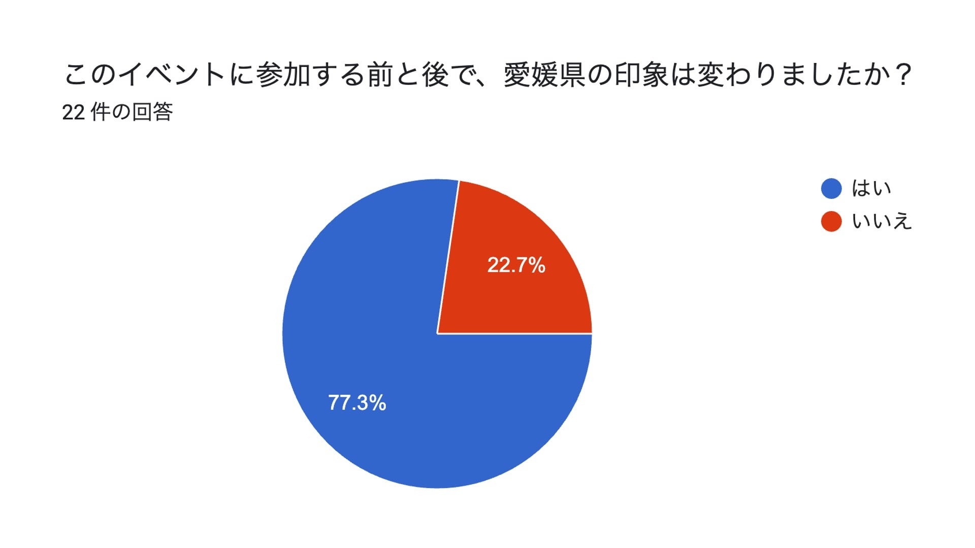また、「このイベントに参加する前と後で、愛媛県の印象は変わったか」という質問に対しては、77.3%の参加者が「変わった」と回答。
