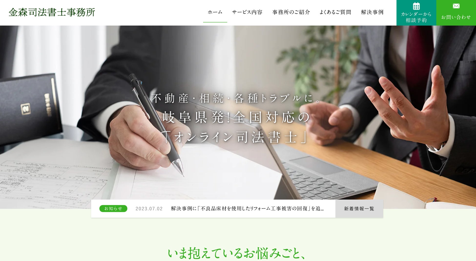 岐阜県羽島郡に事務所を構える金森司法書士事務所は、1963年の創業以来、半世紀以上にわたり地域のお客様の相談に対応してきました。今回、事務所をリニューアルするタイミングでホームページを開設。株式会社リーピーの提案により、全国からの相談に対応できる新コンセプト「オンライン司法書士」の打ち出しとともにリブランディングをいたしました。さらに、「できるだけ気軽で負担のない法的サービスを提供したい」という金森司法書士事務所の思いを具現化するため、サイトデザインやコンテンツの各部分に、お客様の相談依頼時の心理的ハードルを下げる工夫を施しました。当事務所のこれまでの経験と知識を活かし、さらに多くのお客様のお悩みの解決へ導くため、事業の拡大を目指します。
