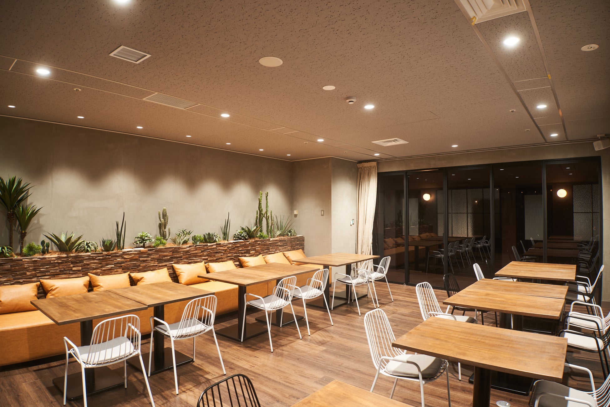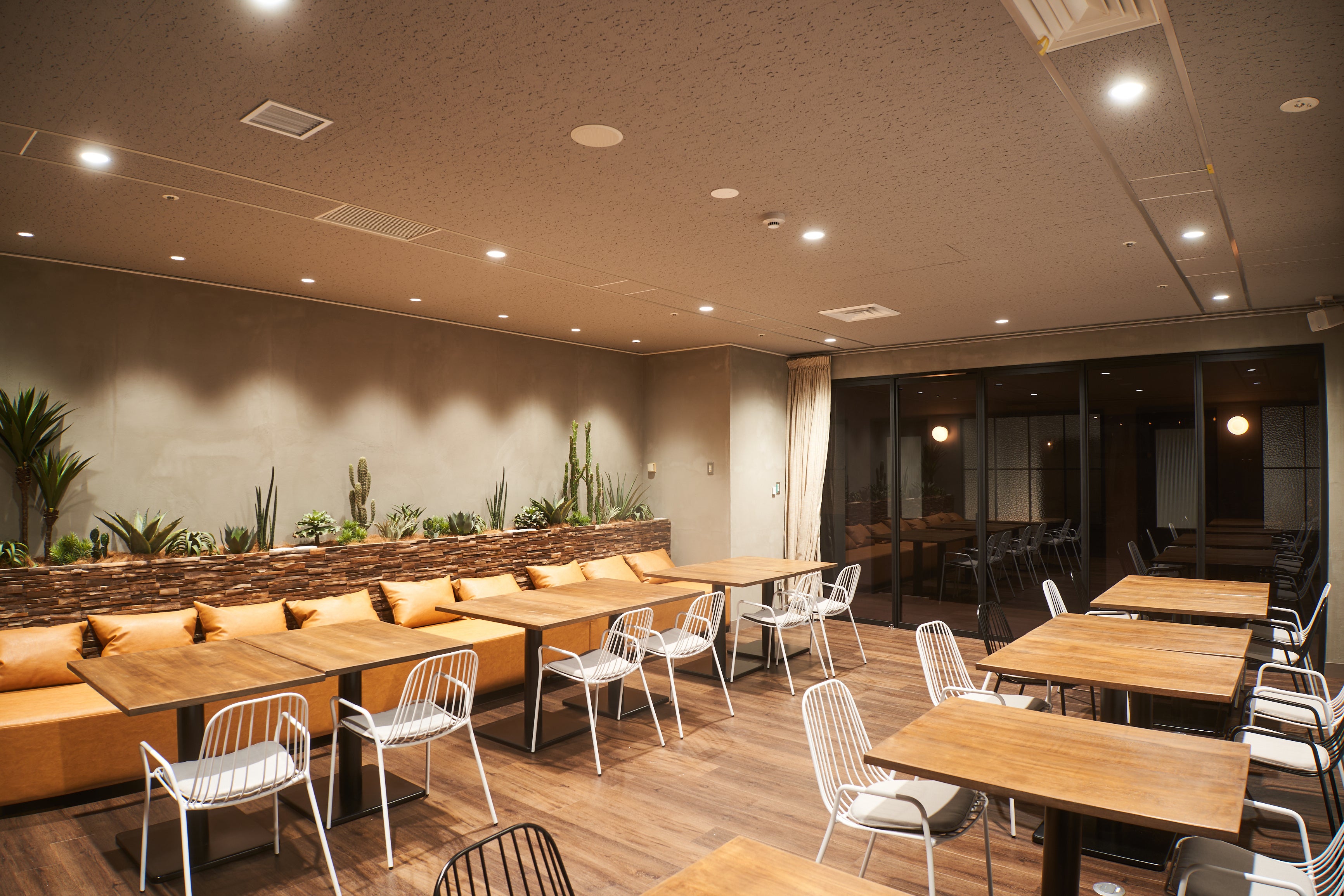 大開口の吹き抜けのテラス席は、地下でも日差しが届き、雨でも濡れずにご利用いただけます。