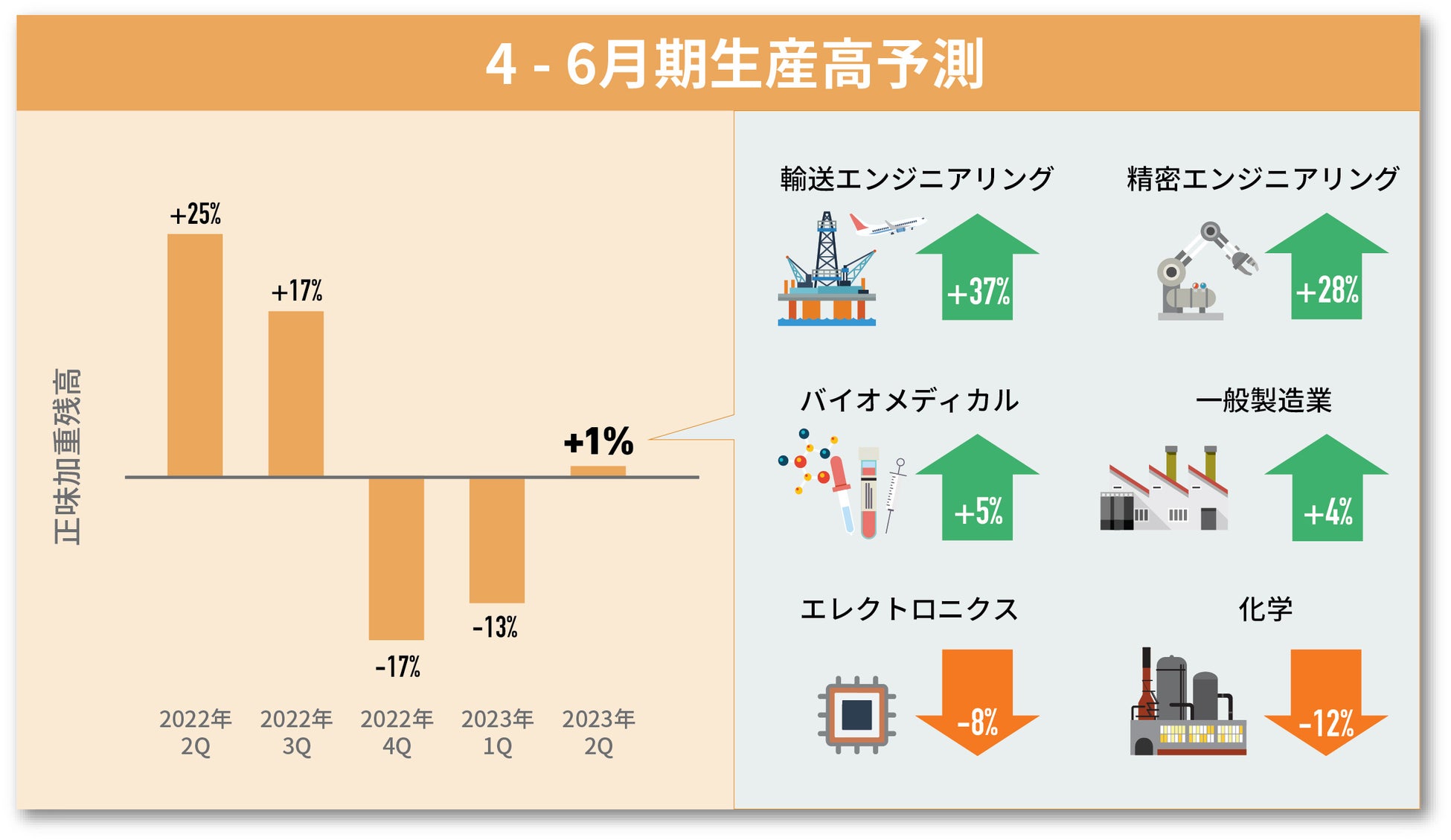 エレクトロニクスと化学を除く全ての部門が2023年第1四半期比で増産を予測しており、全体ではプラス1%、3四半期振りの増産予測となった。
