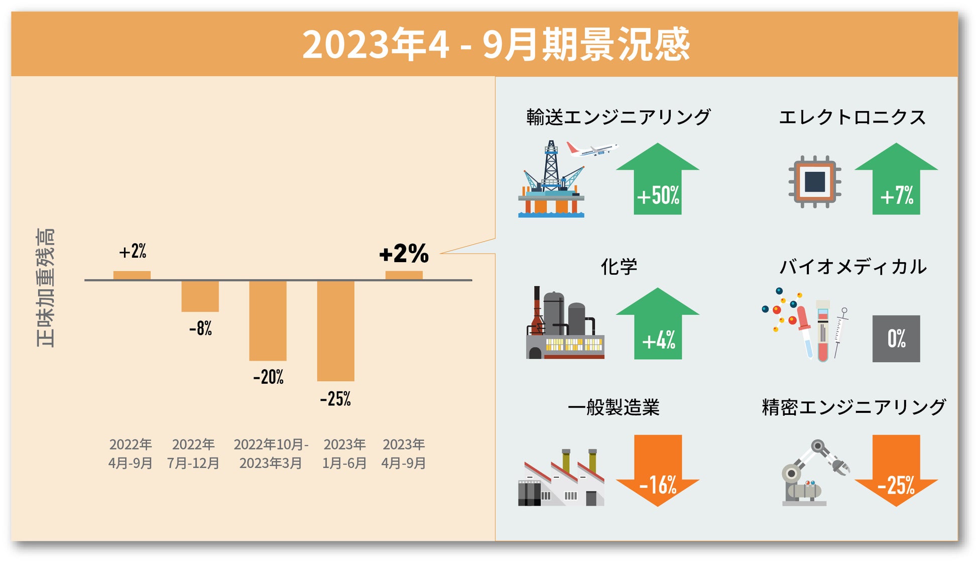 製造業の景況感*1は、中国における「ゼロコロナ」政策解除による経済活動の再開に伴い、需要の回復と在庫レベルの正常化が今後6カ月の経営改善をもたらすことへの期待から、業況改善の予測が悪化の予測を上回った。ただし、サプライチェーンの課題は緩和されたものの、事業コストは上昇しているため、業況が改善すると予測した企業が12%であるのに対し、悪化の予測は10%となった。2023年4月から9月までの正味加重残高指数は、2023年第1四半期(1~3月)と比較してプラス2%となり、1年ぶりに悪化から反転し、改善傾向を示した。