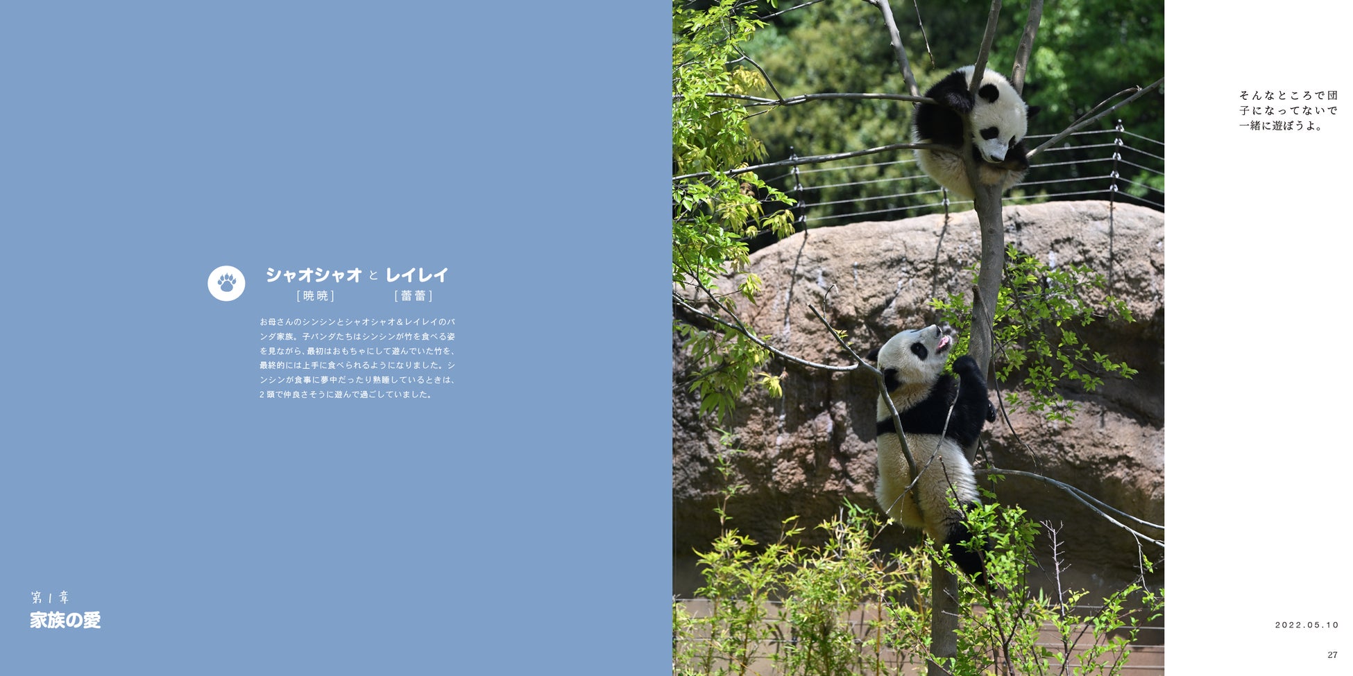 最近では2025年6月末頃に「アドベンチャー・ワールド」の4頭のパンダが中国へ返還されることが発表されました。シャオシャオとレイレイも、来年の2月には返還期限を迎えるため、彼らが日本にいる時間は限られています。だからこそ、このかけがえのない瞬間を「今」かたちにして残したい。その思いを、多くの皆さまと共有できれば幸いです。
