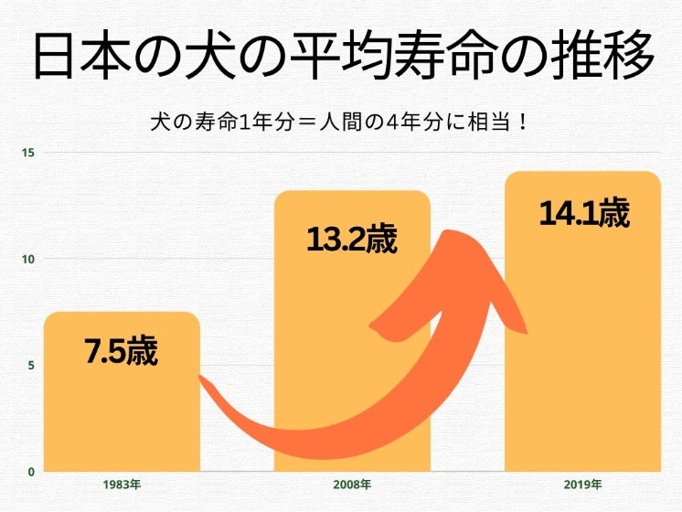 日本でも犬の平均寿命は、2008年から2019年で+0.9歳と、この10年で1歳近くも延びているそうです。1年というと短いようにも思えますが、犬の寿命1年分といえば人間の年齢に換算すると4年分にも相当します。2019年度の犬の平均寿命が14.1歳であることからも、犬の寿命1年は飛躍的な延びと言えます。(※1)