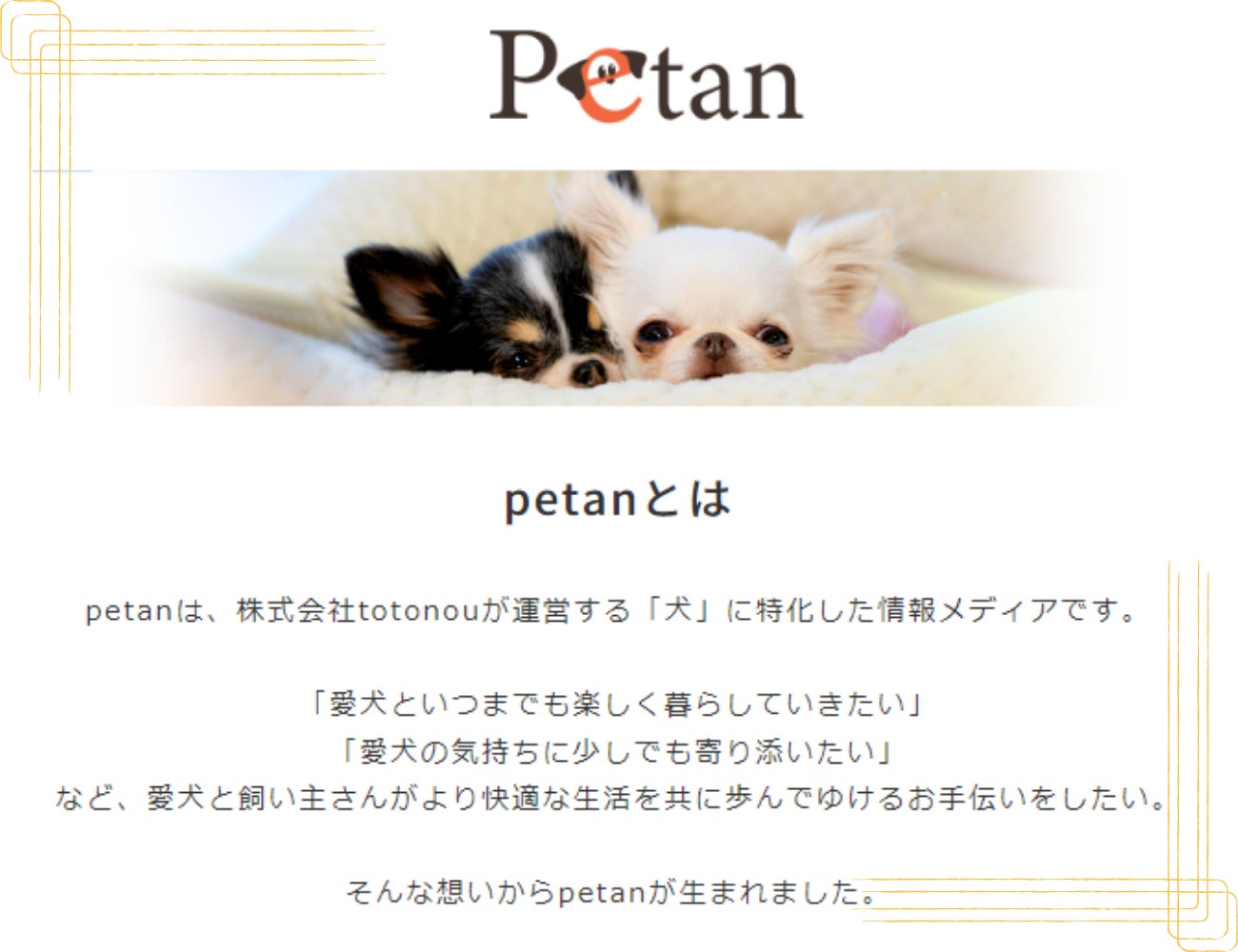 Petanは、株式会社totonouが運営する「犬」に特化した情報メディアです。犬と暮らすなかで生まれる疑問や不安を解消し、愛犬と飼い主さんがより快適な生活を共に歩んで行けるお手伝いをしたいという想いで作りました。愛犬家へのアンケート調査や獣医師さんへの聞き取り調査などを基にした独自企画も発信しています。Petanで得た気付きがペット商品の企画開発に活かされることもあります。