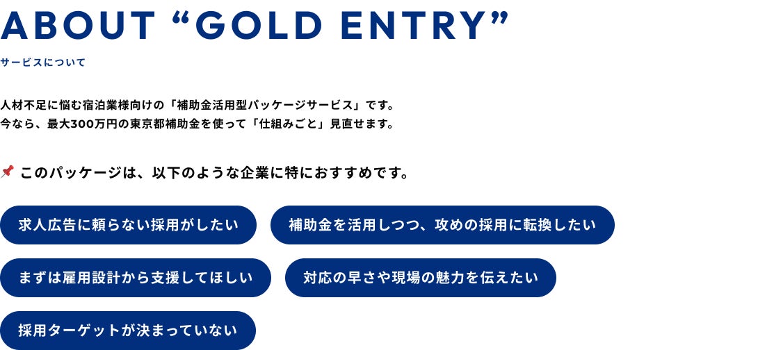 本パッケージは、東京都内で宿泊業を営む中小企業(旅館・ホテル・簡易宿所など)を対象に、LINE応募、自動応答、採用サイト、動画、スカウトなどを連携させ、応募が自然に集まる導線を設計。