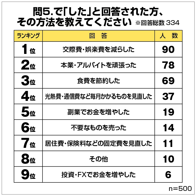 節約の王道は、今不要な支出を避けることですが、やはり娯楽費がトップでした。その次には食費がくるかと思われましたが、「本業やアルバイトを頑張った」が2位にランクイン。節約するよりも、収入をアップさせようと考える人が多かったということです。