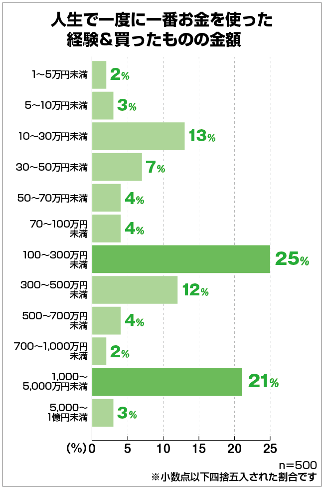 「人生で一度にお金を使った経験&買ったもの(自社調べ)」に関するアンケートにご協力いただいた方は以下の通り。