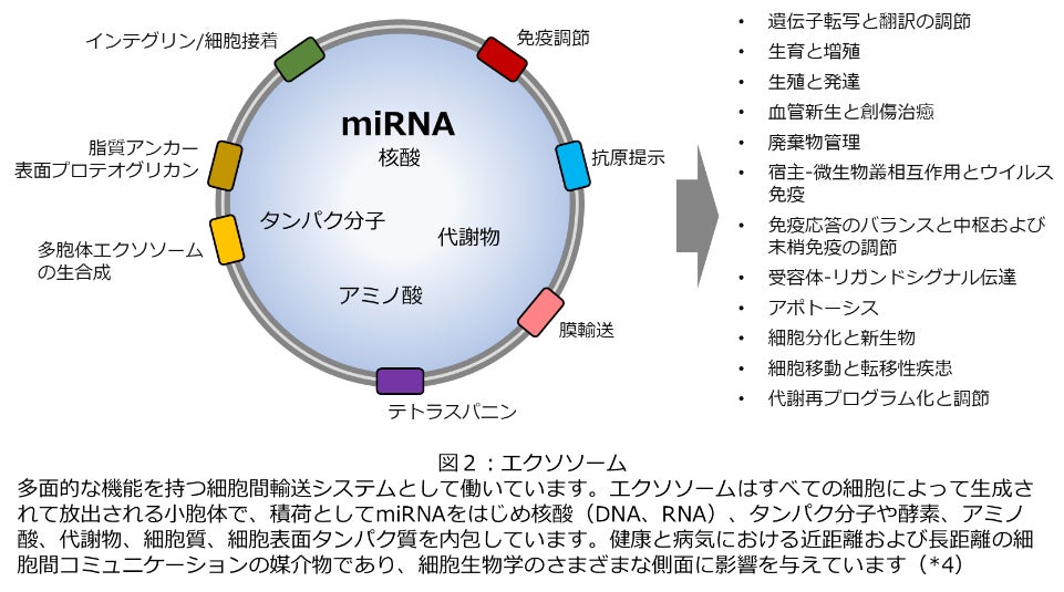 が機能していることが報告されたことから(*2)、エクソソームは細胞間でmiRNAを送達するための情報伝達物質として働いています。近年、生体におけるmiRNAの機能性は注目されており、miRNAの機能を発見した功績によりマサチューセッツ大学のビクター・アンブロス教授とハーバード大学のゲイリー・ラブカン教授は2024年ノーベル生理学・医学賞を受賞しました(*3)。