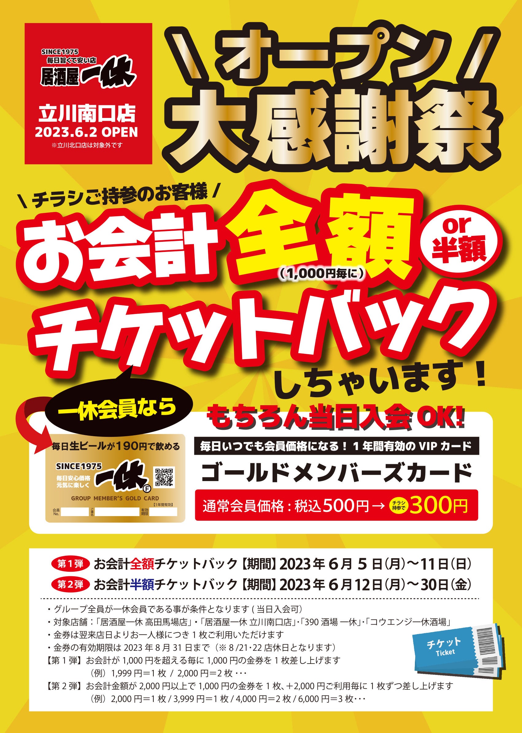 【プレミアムモルツ税込190円!】居酒屋一休立川南口店を6月2日にフルリニューアルオープンいたしました。一休4店舗の新店、リニューアルオープンを記念してチケットバックキャンペーン開催いたします。