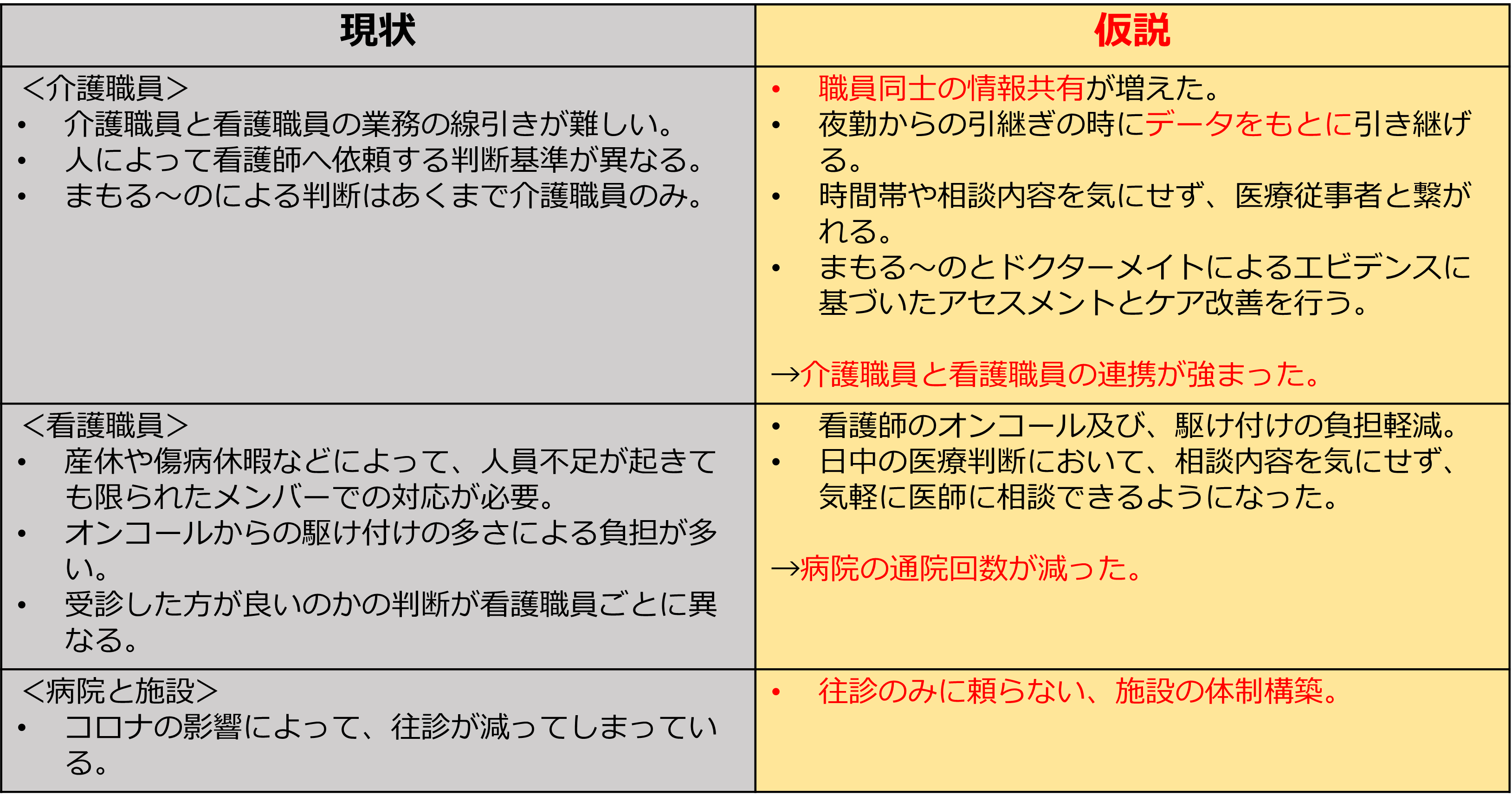 今までの研究でICT見守り機器類の導入による業務効率化は明らかにされていますが、さらに看護師と介護職員の職種間連携によって、さらなる負担軽減が可能かを実証します。