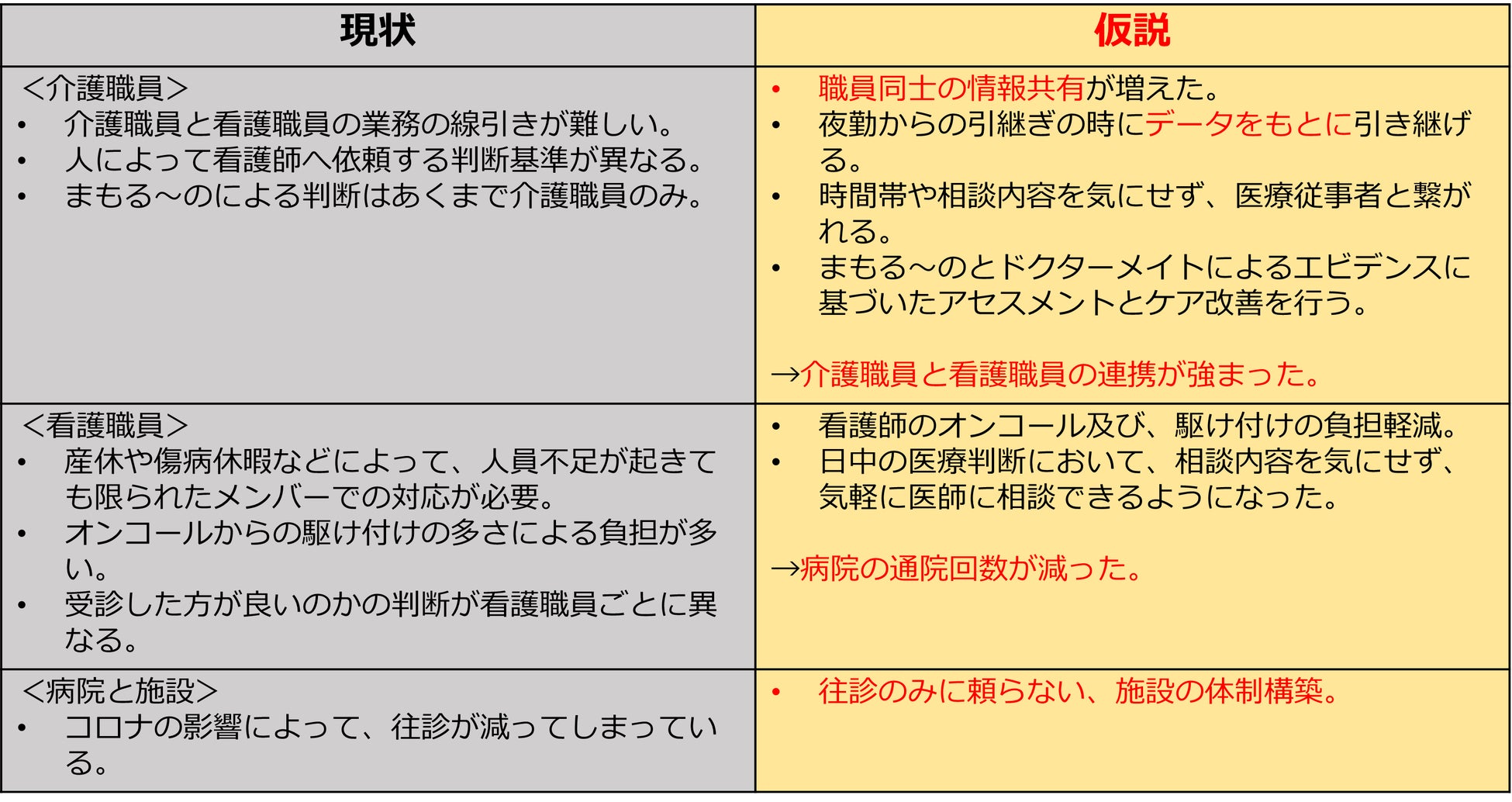 | 実証内容 | ・ドクターメイトのサービスを導入する前後でアンケートを実施 ・「まもる~の」と「ドクターメイト」のサービスの親和性について アンケートを実施 |