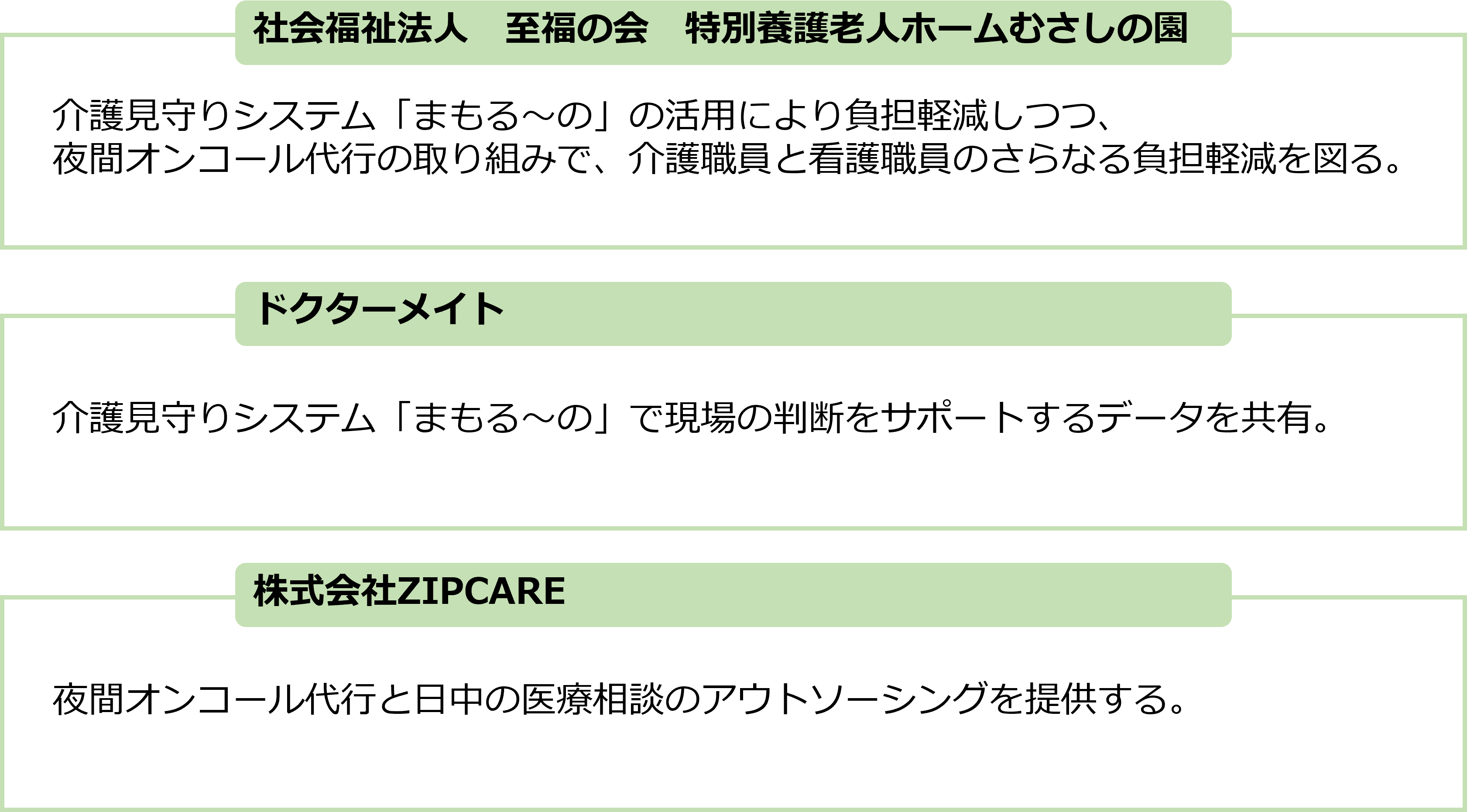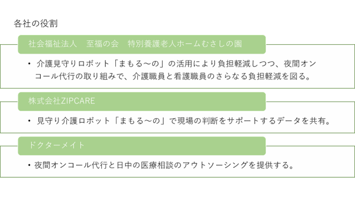 2社での実証実験では、既に『まもる~の』100床が導入されている「社会福祉法人 至福の会 特別養護老人ホームむさしの園」に、ドクターメイトが提供しているサービスを導入することにより、介護職員の業務負担軽減や業務効率化だけでなく、看護職員との多職種連携にもつながることを実証します。