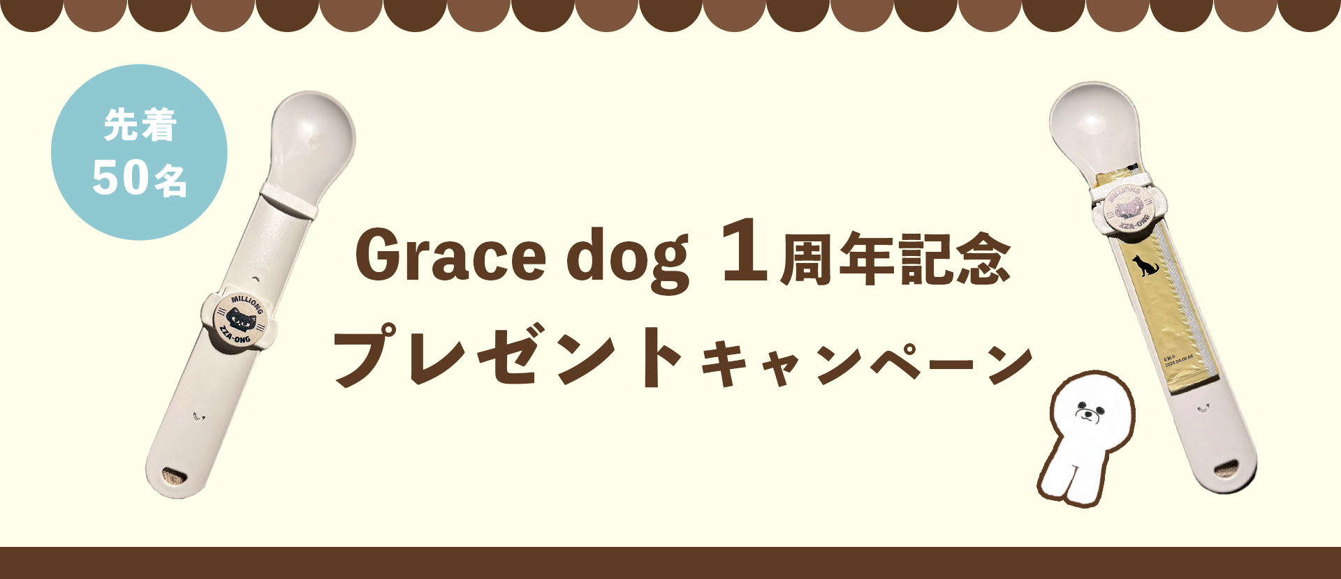 今なら、Grace dog公式オンラインストアにて製品をお買い上げいただいた方に、先着50名限定で、「液状おやつ用スプーン: ちゃおんスプーン」(2,530円相当)をプレゼントいたします。