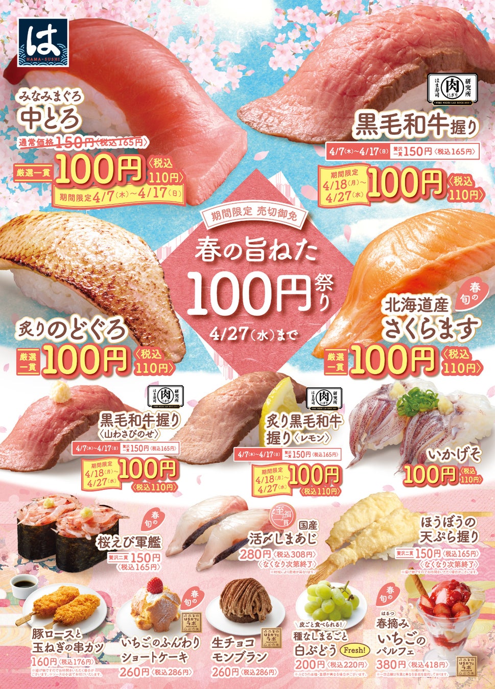 株式会社はま寿司(代表取締役社長:遠藤 哲郎 本社:東京都港区)が展開する100円寿司チェーン「はま寿司」は、4月7日(木)から、期間限定で人気の商品を100円(税込110円)の特別価格で提供する「春の旨ねた100円祭り」を開催します。