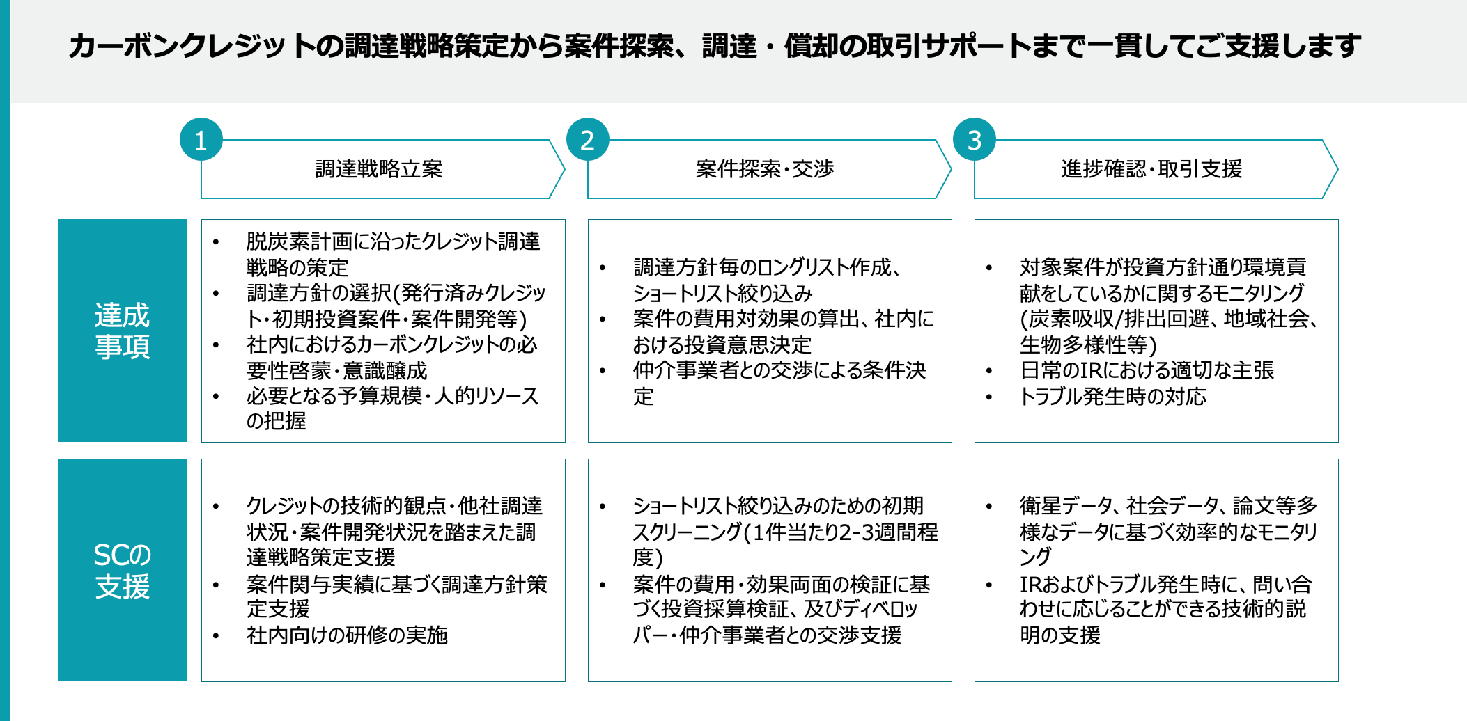 当社では、以下の通り、クレジット調達戦略の策定からプロジェクトのソーシング、調達及び償却の取引サポートまで、カーボンクレジットの調達に関する包括的な支援サービスを提供しています。