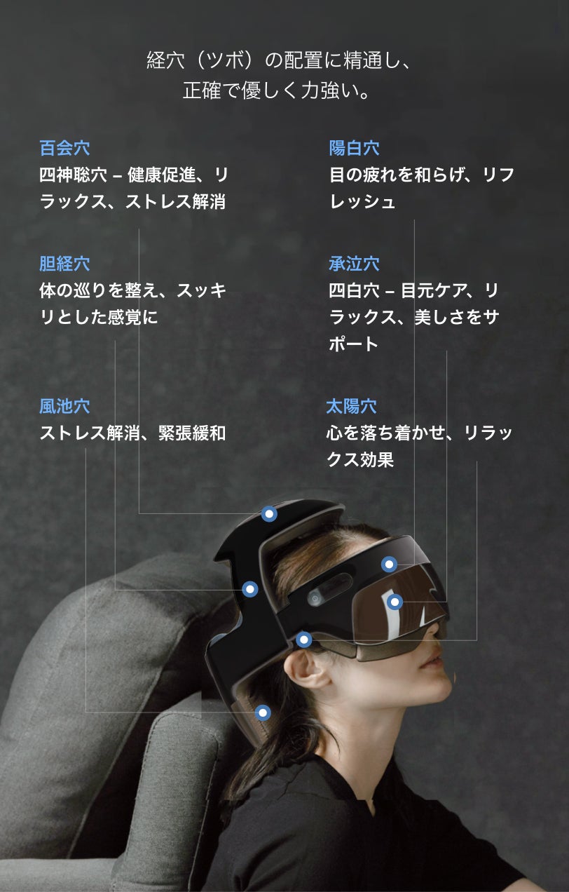 頭頂部の百会(ひゃくえ)や太陽(たいよう)など主要なツボを的確に刺激するエアプレスマッサージ、温感機能付きの目元ケア、後頭部を優しく包み込むような指圧模倣マッサージを統合。わずか15分で、プロによる施術を受けたかのような深いリラクゼーションへと導きます。特に、デジタルデバイスの長時間使用による眼精疲労や、それに伴う頭全体の緊張感の緩和に貢献します。