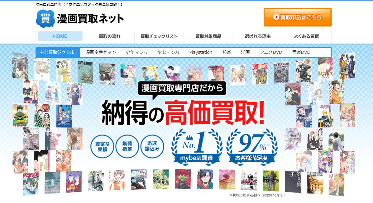 少年漫画・青年漫画・少女漫画などはもちろん、アニメDVD/CDやゲームなどの買取も可能。各種サービスの⽐較検証サイト「mybest」様にて、2年連続顧客満足度98%1位を獲得する実績を持つ。