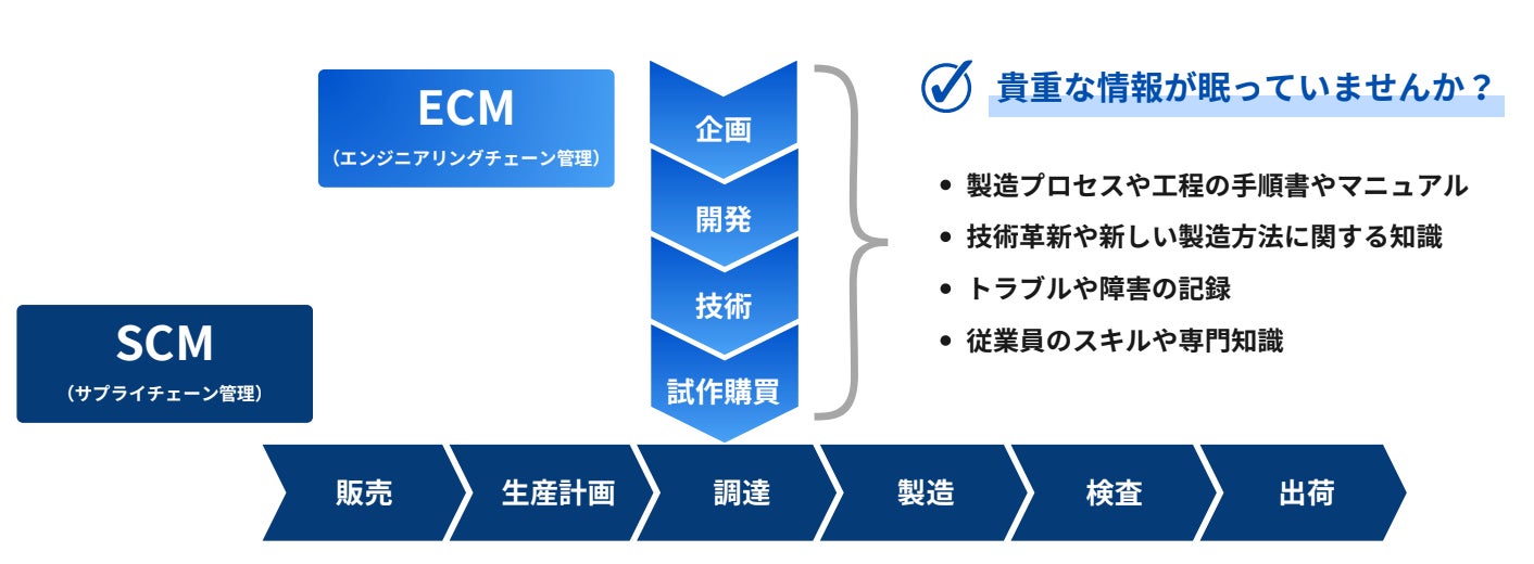 エンジニアリングチェーンとは、製造業・メーカーにおいける設計を中心とした一連の業務プロセスのつながりを指します。 企画、開発、技術、試作購買の流れを経て、サプライチェーンでの流通に繋げる重要な要素です。 その管理を効率化する手法を「エンジニアリングチェーン・マネジメント(ECM)」と呼びます。