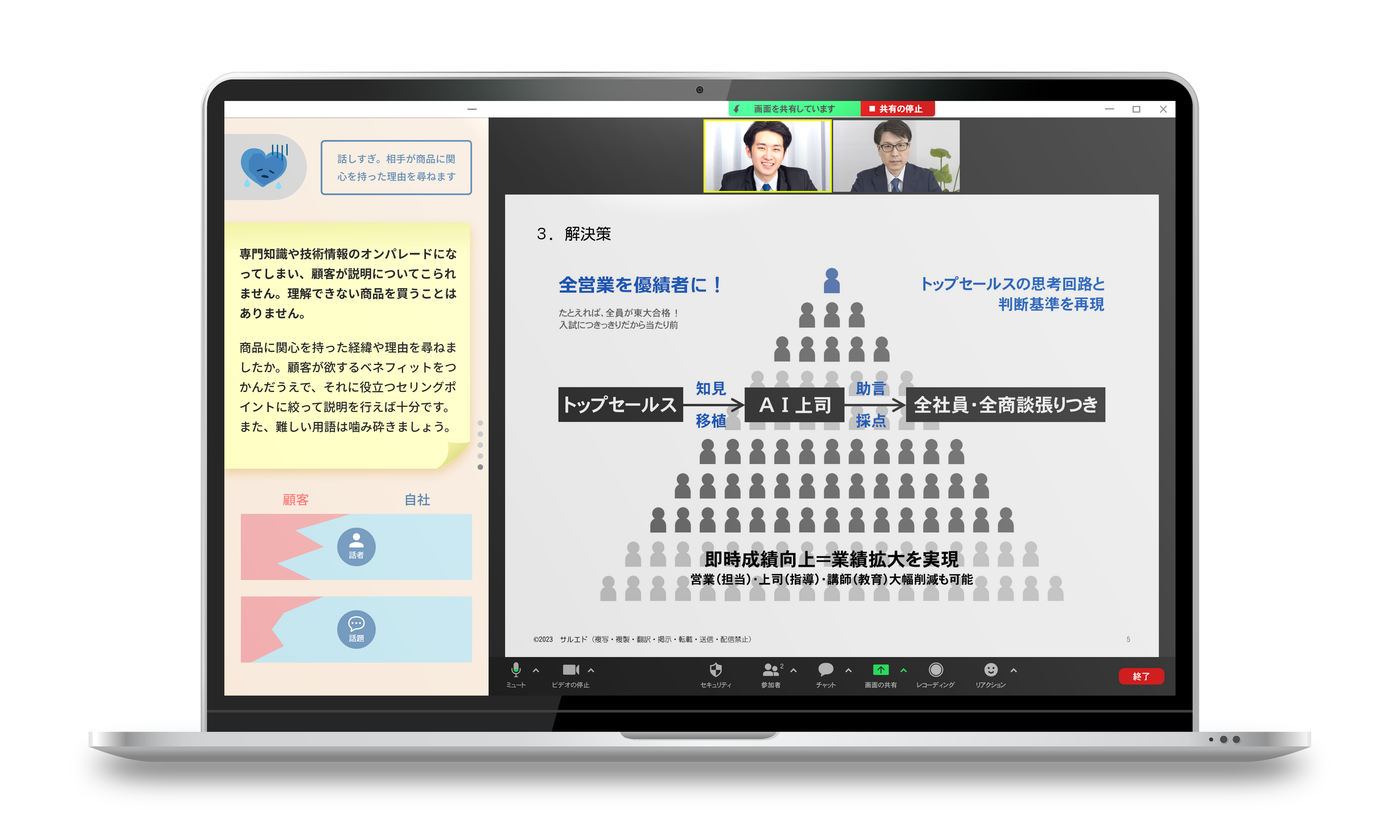 「サルトル」はトップセールスの最良知見を搭載した文章生成AIが部下につきっきりになり、オンライン商談と同時並行で「カンペ」を表示します。