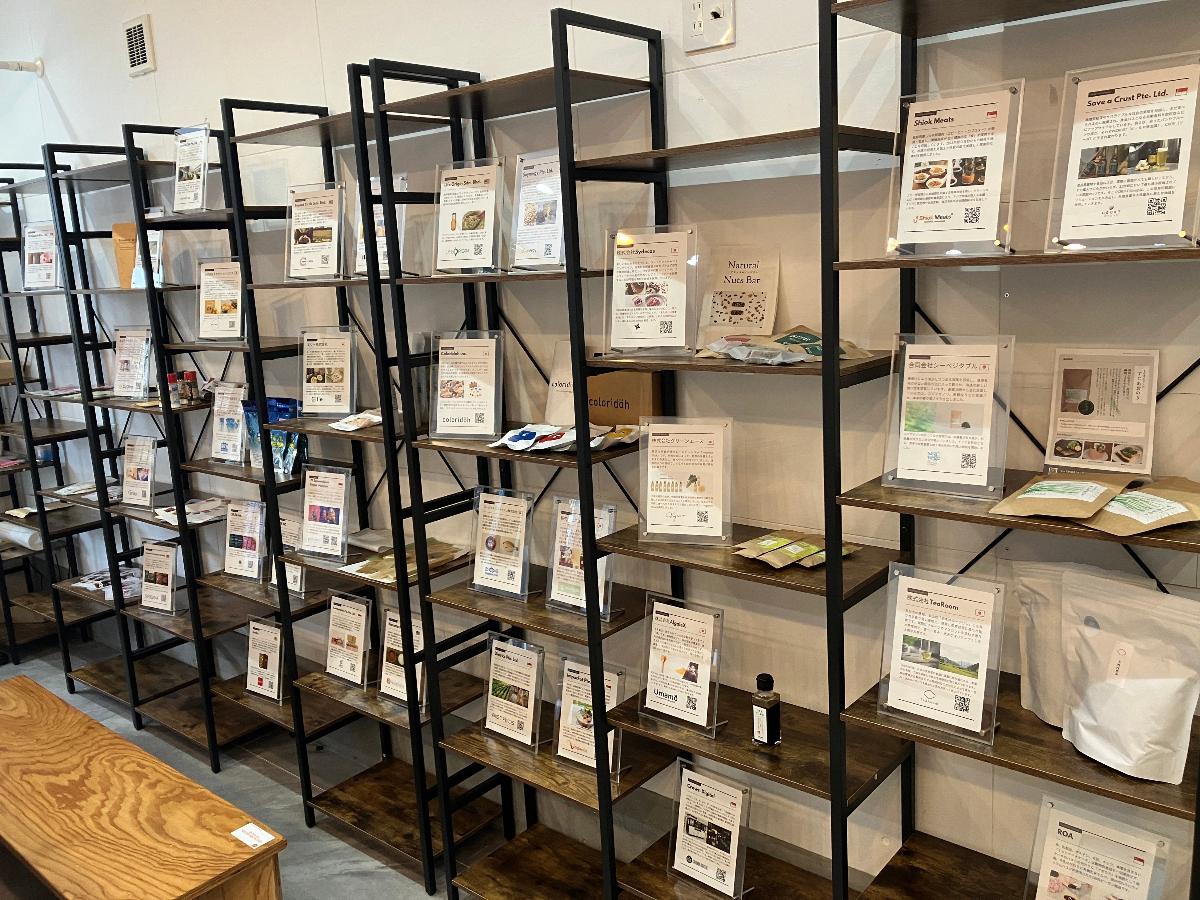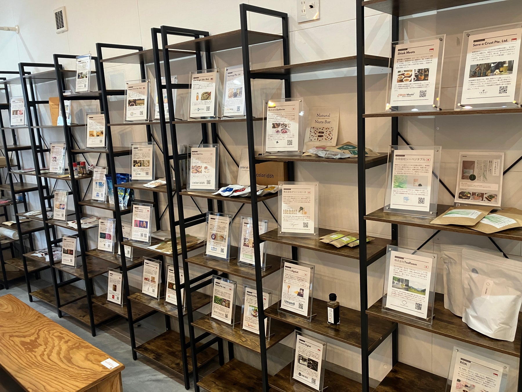 また、同施設内には廃棄野菜問題の解消に着目して生まれた、規格外野菜等を活用したヘルシーおやつ「Vegemin Stick」(株式会社グリーンエース提供)、蒟蒻を使用したグルテンフリー・アニマルフリーの「NinjaFoodsナッツバー」(株式会社Sydecas提供)など30社以上ものフードテックの最先端がわかるプロダクト・サービス等が展示・紹介されています。イートインスペースをご利用いただく場合にはこれらの展示を随時ご覧いただけます。