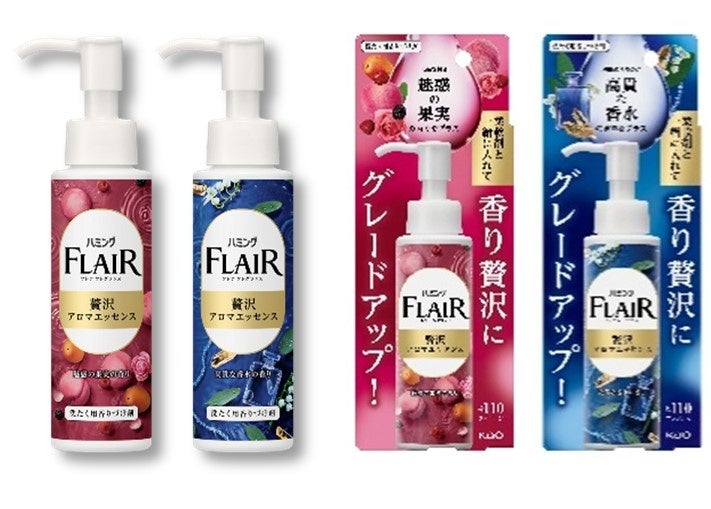 また、柔軟剤と一緒に入れて、贅沢にグレードアップした香りを楽しめる新アイテムとして、プッシュタイプの洗たく用香りづけ剤「ハミング フレア フレグランス 贅沢アロマエッセンス」も新発売します。上品な甘さにグレードアップする「魅惑の果実」の香りと、洗練の爽やかさにグレードアップする「高貴な香水」の香りの2香調をラインアップしました。