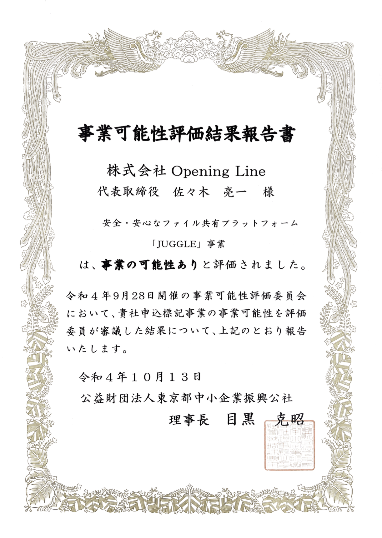 次世代型ファイルセキュリティシステム「JUGGLE」が、公益財団法人東京都中小企業振興公社の事業可能性評価事業において「事業の可能性あり」と評価されました