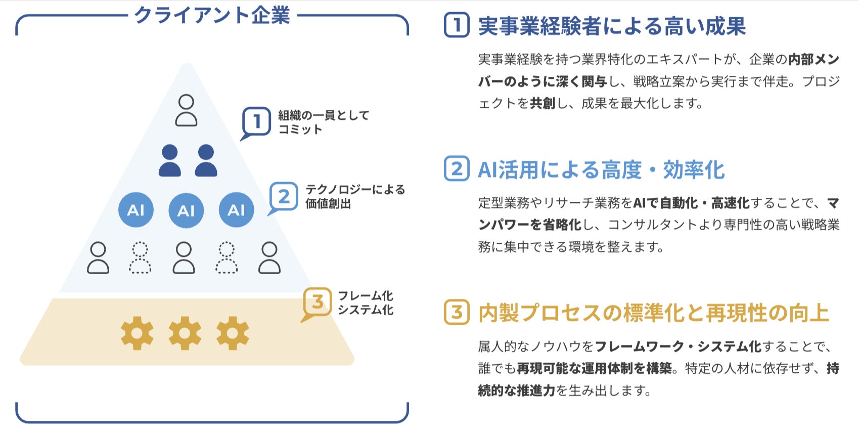 「実事業経験者によるPMO × 独自AI調査基盤 × 領域別専門人材」