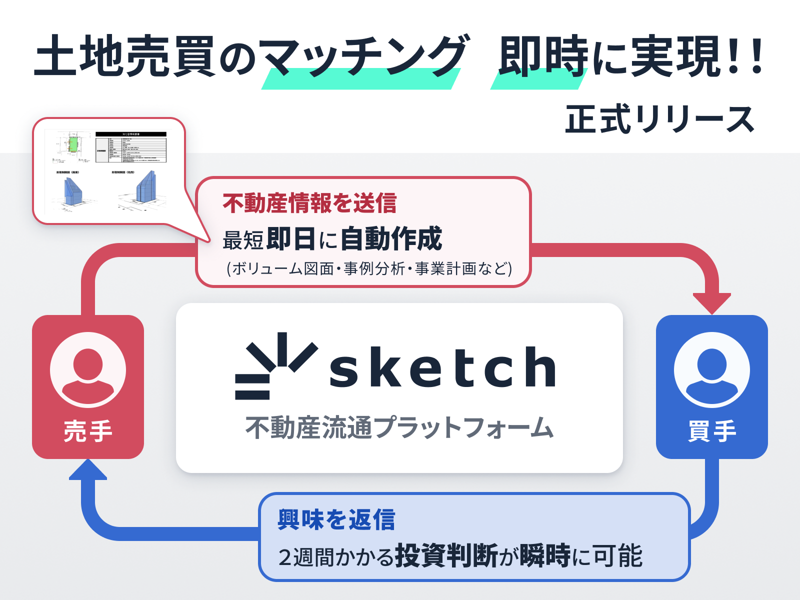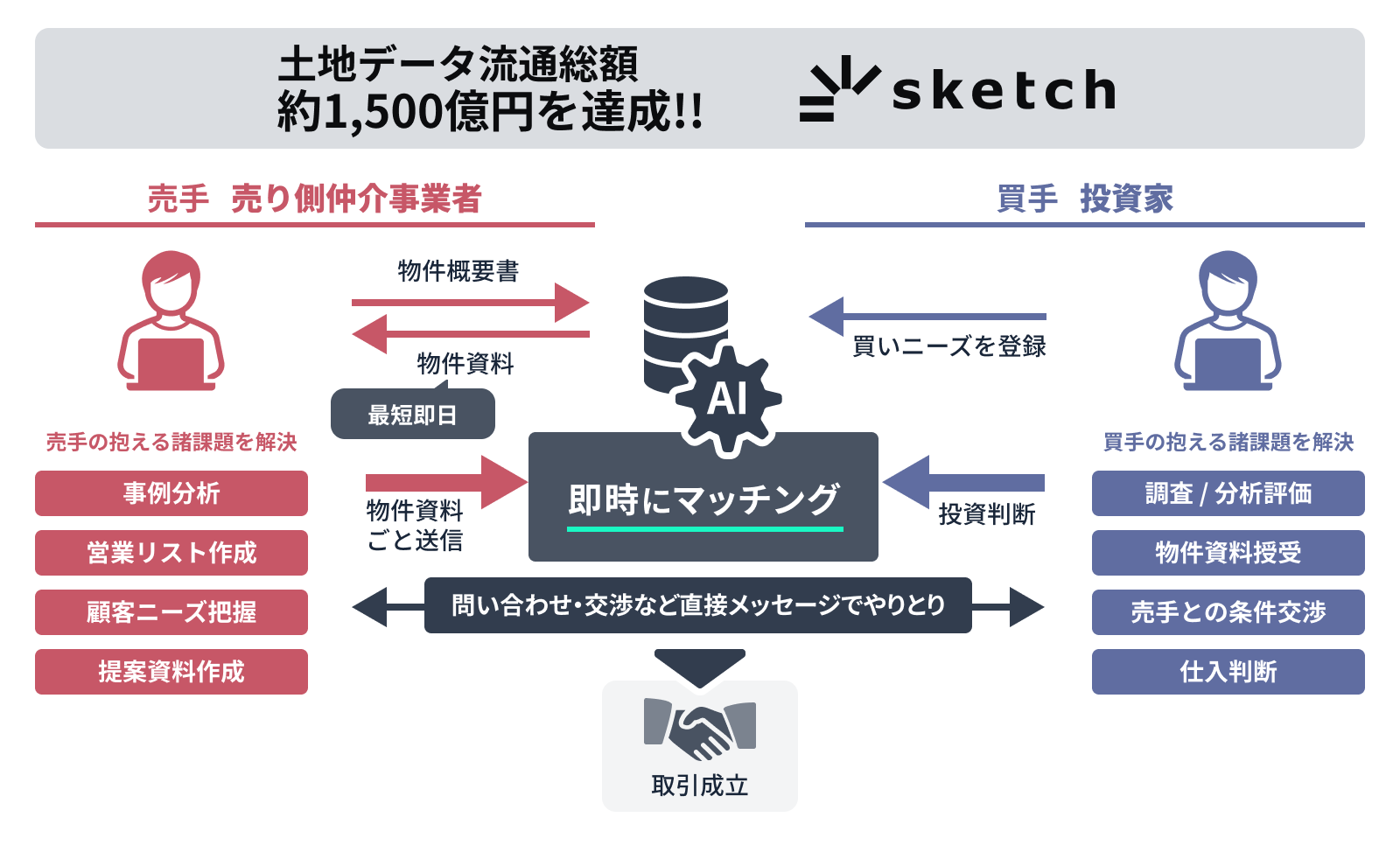 業務効率化に加え、高精度かつ迅速な査定およびマッチングを実現し、売手と買手、双方の売上拡大を支援するために、この度「sketch」を本格展開いたします。