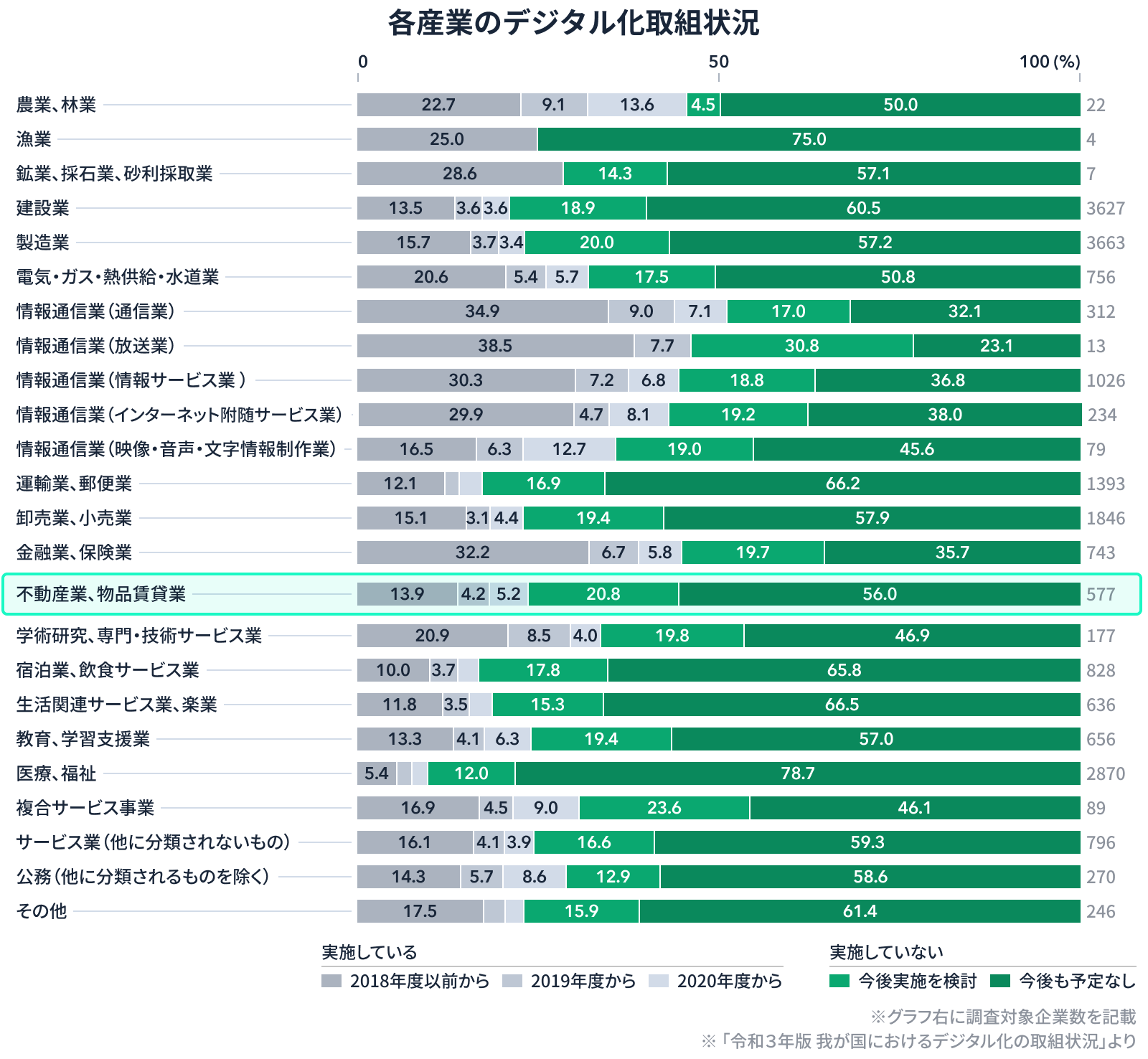 総務省が実施した「令和3年版 我が国におけるデジタル化の取組状況」の調査結果によると、不動産業界において、デジタル化を「実施していない、今後実施を検討」および「実施していない、今後も予定なし」との回答の合計が、76.8%となっています。この数値は、「その他」を除く23業種中ワースト7位という結果です。