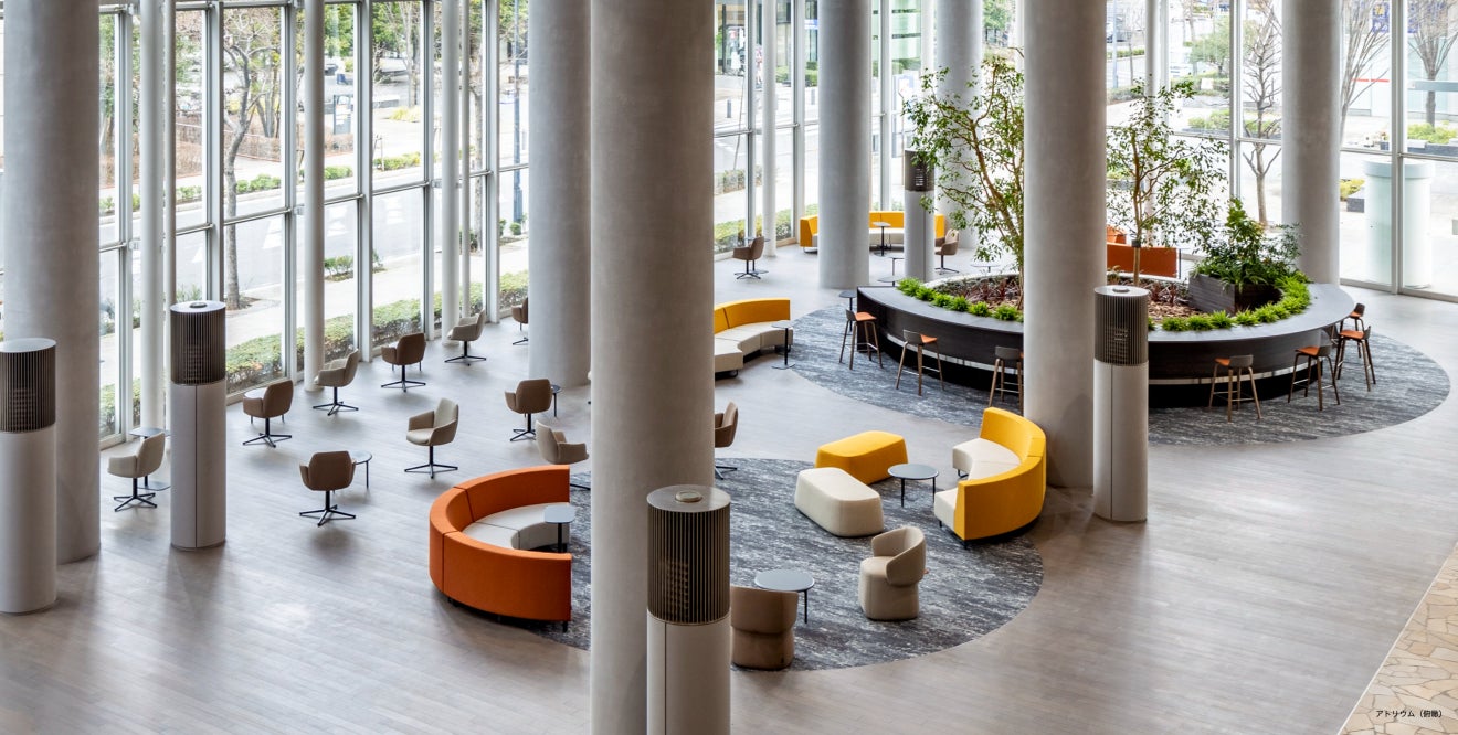 グランモール公園沿いに位置する地上12階(高さ約70m)・地下4階の複合ビルで、地上階には商業施設やオフィスが入ります。2004年に開業し、20年後の2024年にHeart of Innovtionというコンセプトのもと、イノベーションを誘発する創造の場、将来の夢を育む空間としてリニューアルしました。港町横浜らしい船のデッキや港のターミナルをイメージしたデザインとなっています。1階のアトリウム空間は、オフィス入居者や店舗の利用者だけでなく、みなとみらいを訪れる幅広い方が自由に集い、憩うことができる場として設計されています。