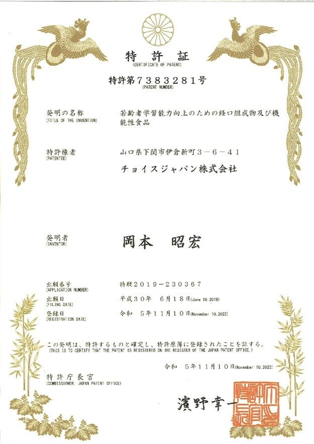 チョイスジャパン株式会社(本社所在地:山口県下関市、代表取締役:岡本昭宏、以下:チョイスジャパン)は、高麗人参由来のジンセノサイドを含有した体調管理をサポートする健康茶「528高麗紅参茶(こうらいこうじんちゃ) 受験王100」が2023年11月20日(月)に特許公報に掲載され、若年者学習能力向上のための経口組成物及び機能性食品として特許を取得したことをお知らせいたします。※自社調べ 高麗人参として日本初(2023年11月調べ)