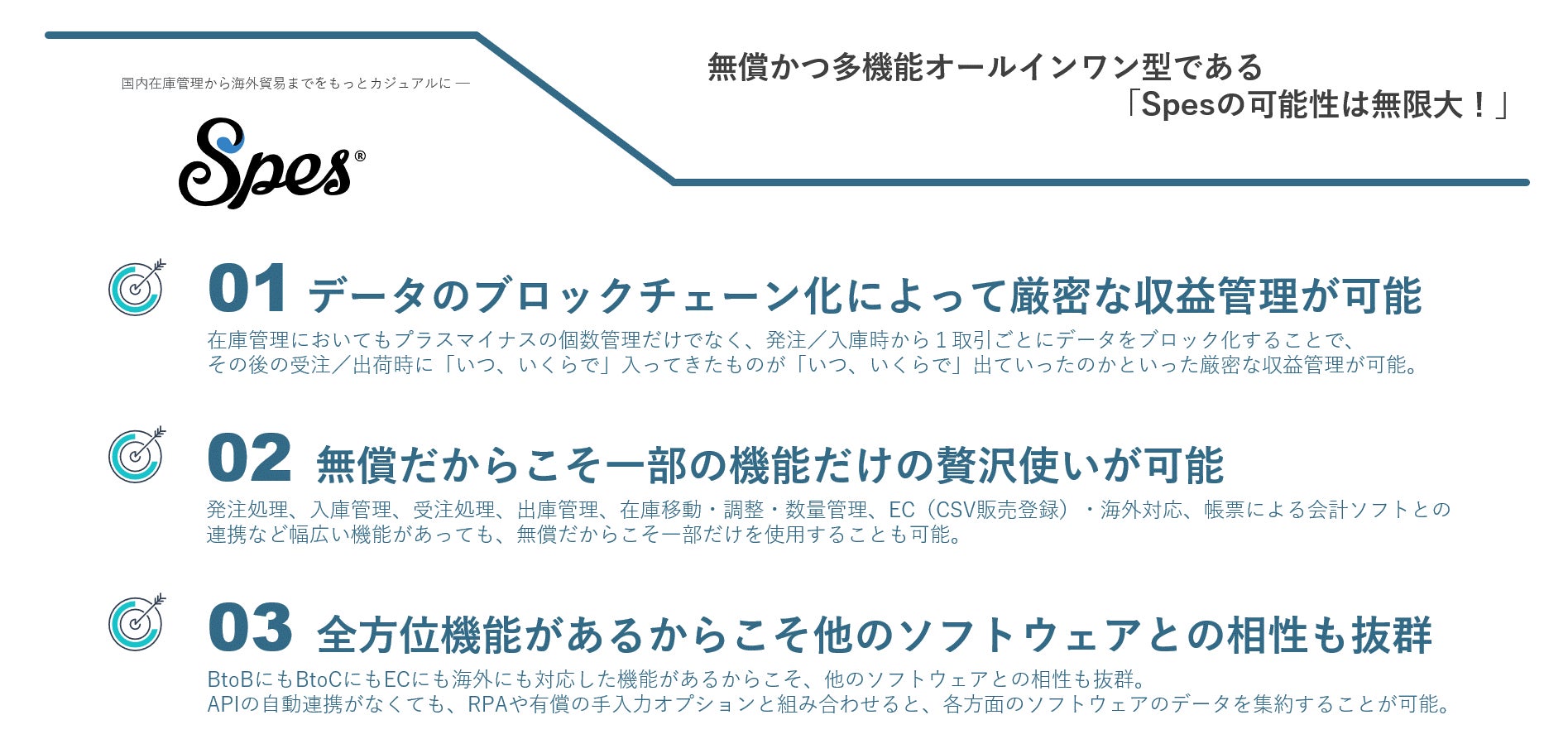 当社が提供するSpes(スペース)は、在庫管理はもちろん受発注から入出庫まで一貫して管理ができるオールインワン一体型のクラウドソフトであり、海外取引(輸出入)にまで対応した多機能性が特徴となっております。