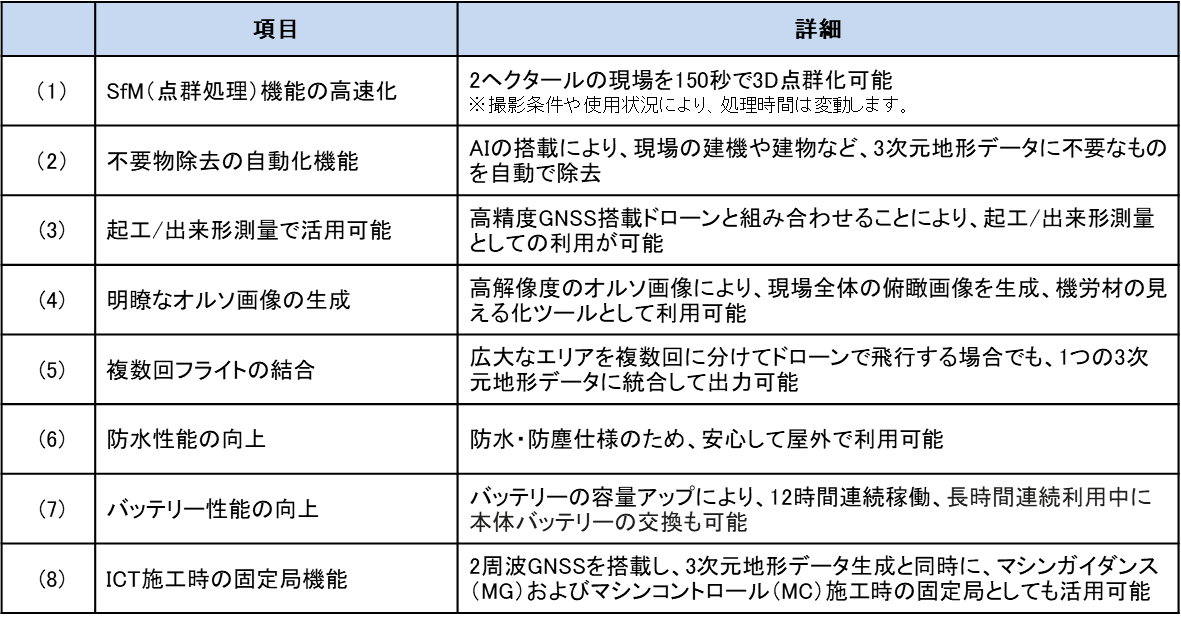 さらに、高解像度オルソ画像※2の生成により、現場全体を俯瞰する画像の生成が可能なため、機労材の見える化ツールとして利用できるほか、広大なエリアを複数回に分けてドローンを飛行させる場合も取得したデータを1つに統合して出力することができる点、防水・防塵仕様のため屋外でも安心して利用いただける点などユーザビリティの観点でも改善しております。