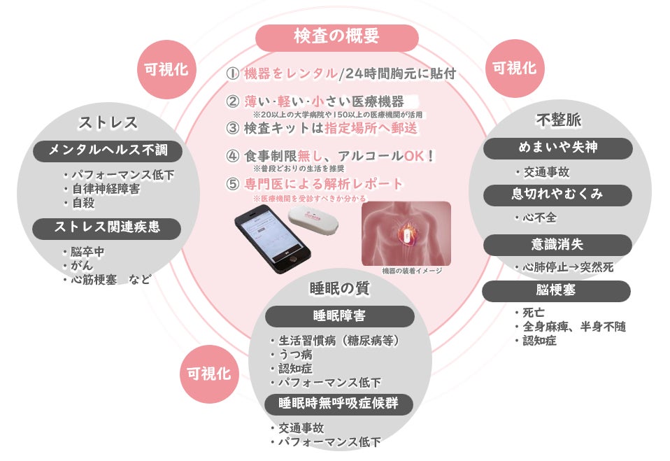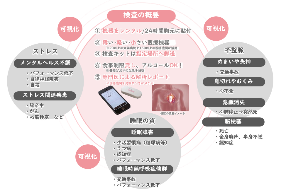当社が提供する「ホーム心臓ドック®」は、 高精度なウェアラブル心電計(以下心電計と言います)を使い、不整脈や睡眠時無呼吸症候群 (SAS)、睡眠の質、そしてストレスを可視化するサービスです。