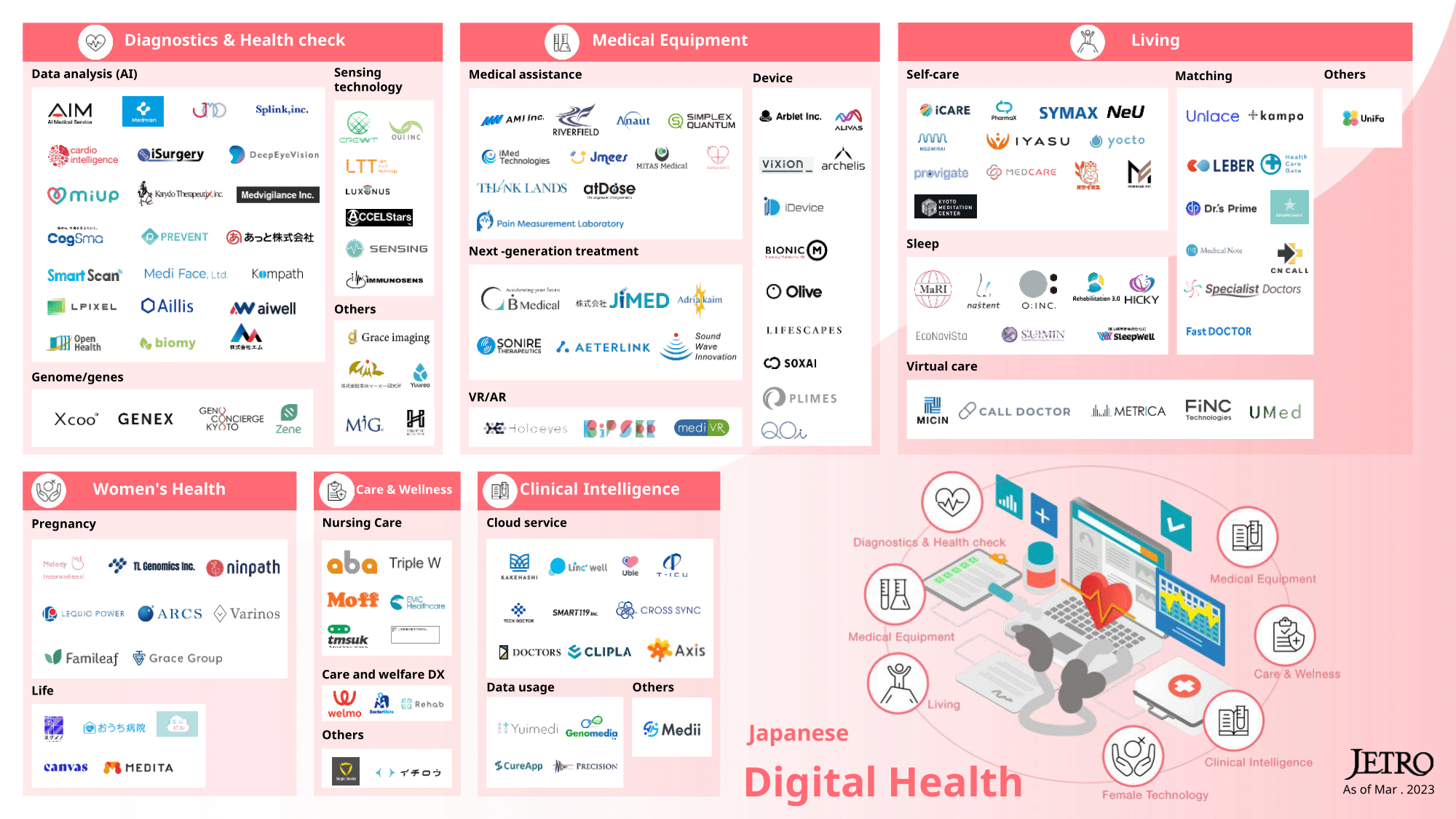 ココロミルは、2023年3月にJETROが主導で作成したデジタルヘルス企業のカオスマップにも「Medical Equipment」分野で掲載していただいていました。