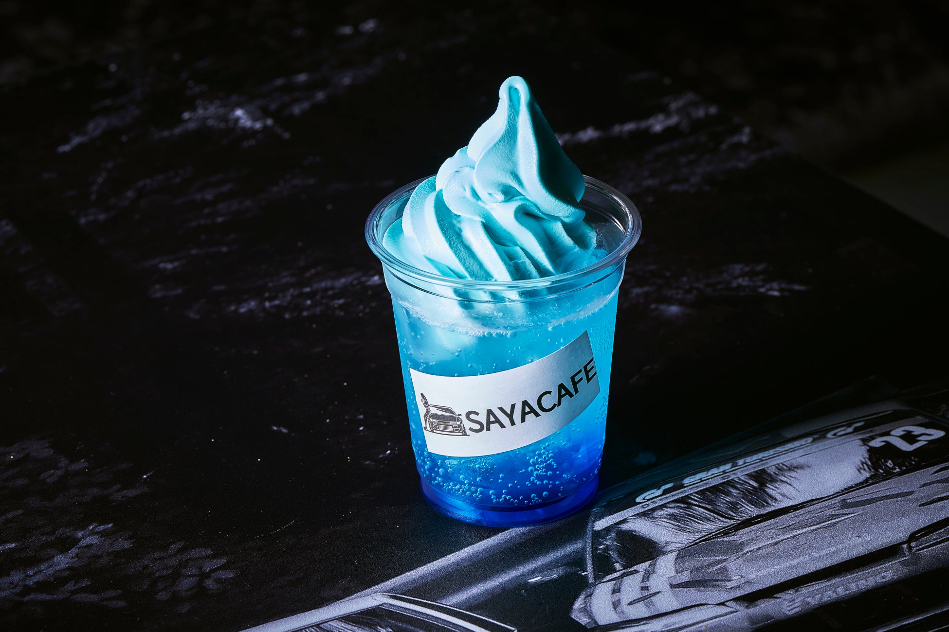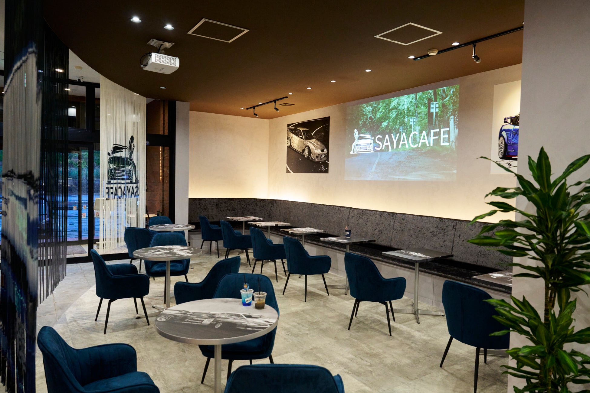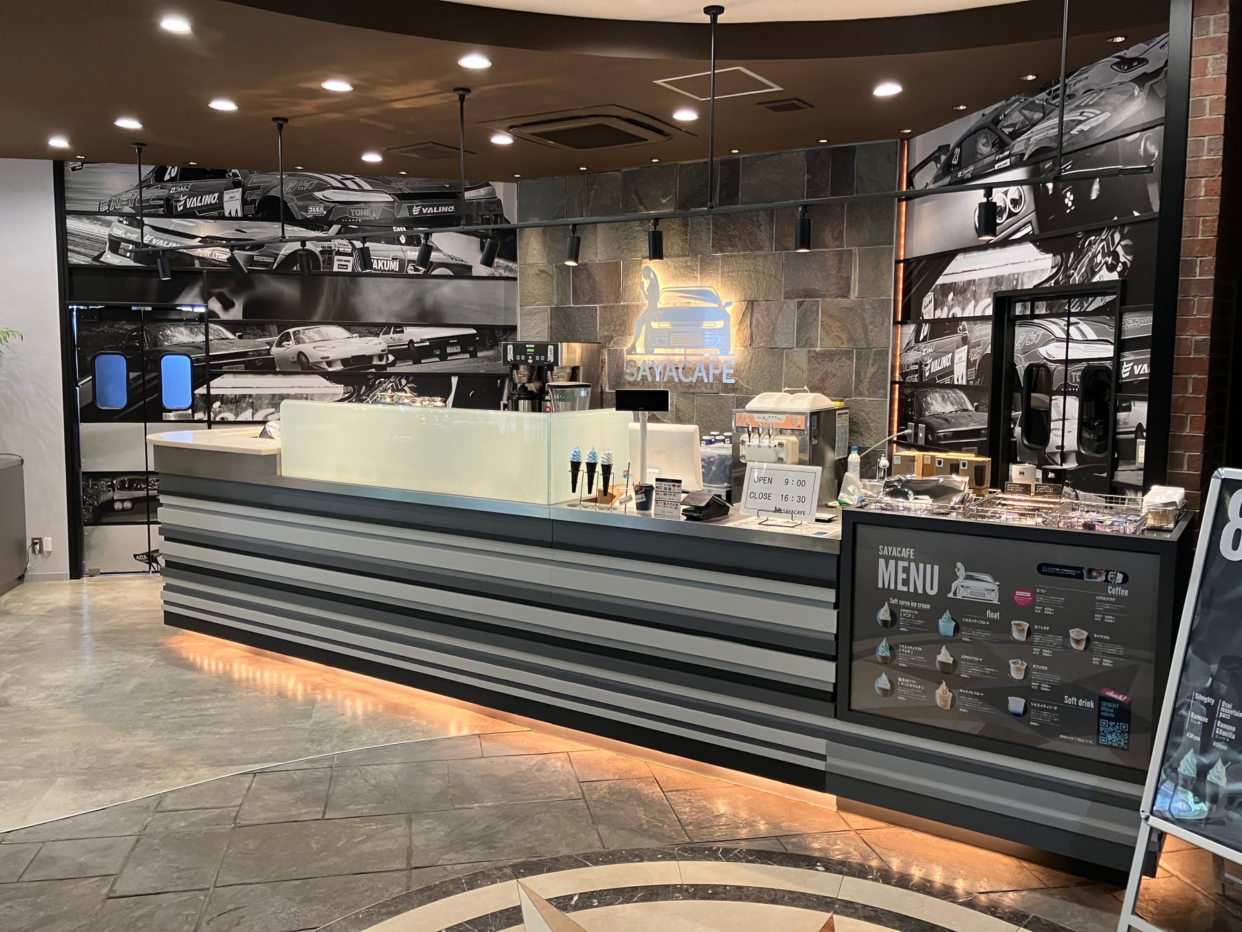 「SAYACAFE」は、下田紗弥加選手の世界観やライフスタイル、そしてモータースポーツの魅力をカフェ空間で体感できる新感覚のスポットです。車好きはもちろん、若年層や女性客にも気軽に楽しんでいただけるよう、オリジナルドリンクやスイーツ、グッズ販売なども展開。店内では下田選手や車両の写真、イラストの展示、ドリフト映像を上映しています。モノトーンとブルーを基調にした落ち着いた空間はまるで“彼女の隠れ家に遊びに来た”ような臨場感が楽しめます。