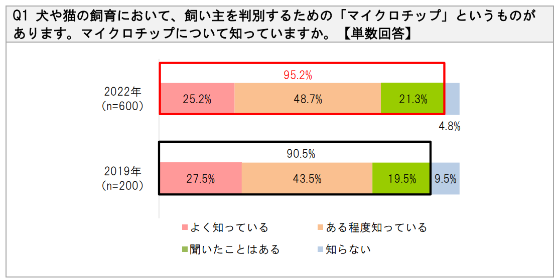 犬・猫飼育者におけるマイクロチップの認知率は95.2%(2019年より4.7ポイント増加)