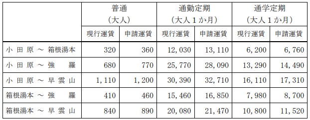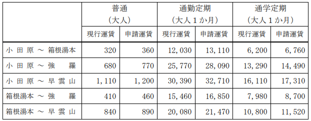 箱根登山鉄道株式会社(本社:神奈川県小田原市 社長:抱山洋之)では、5月11日(水)、関東運輸局長あてに鉄道線(小田原駅~強羅駅間)旅客運賃の変更認可申請を行いました。