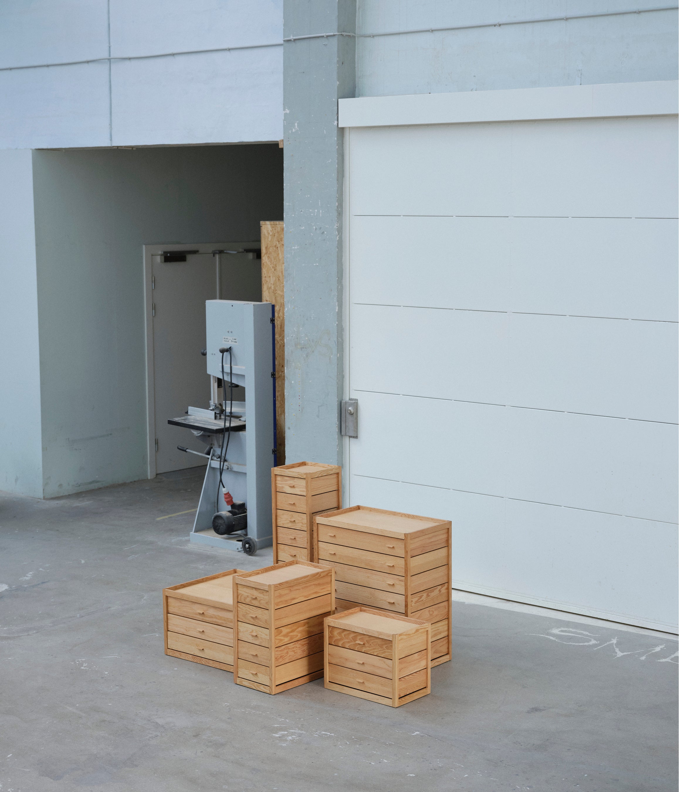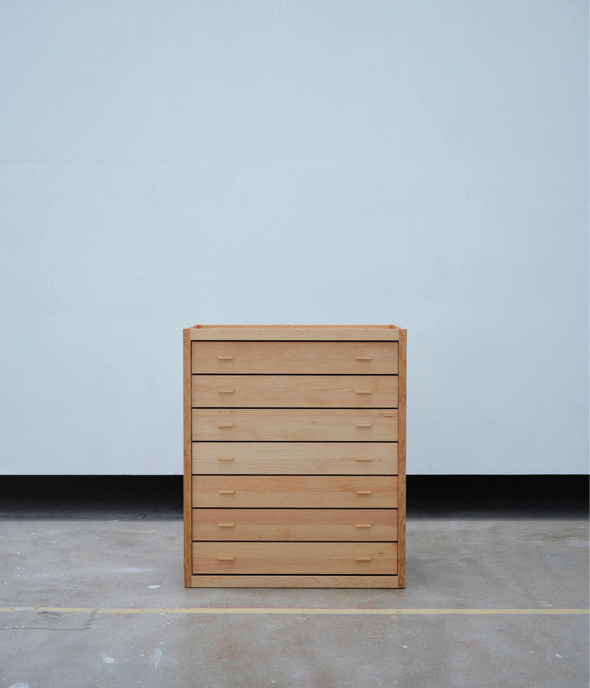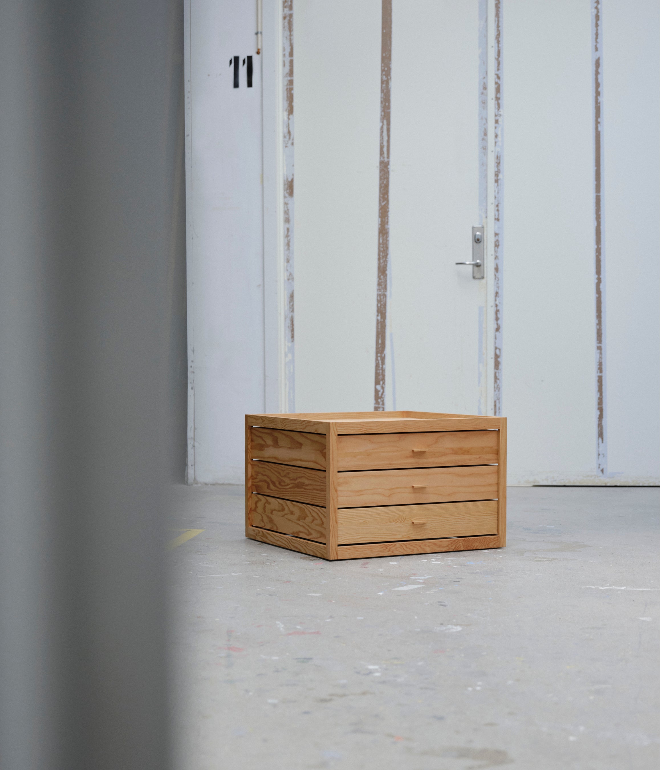 本展の素材は、2011年にカール・ハンセン&サン社によって事業が継承され、デンマーク最古の家具工房と言われたRud. Rasmussen(ルド・ラスムッセン)に残されていたオレゴンパイン材が使用されています。板材は引き出しに加工され、木箱をモチーフにしたフレームの内側に保護され積み重ねてられています。共通の構造に異なるフォルムのキャビネットで構成される遊び心に加え、個々に独自のスタイルと機能を備えたコレクションです。