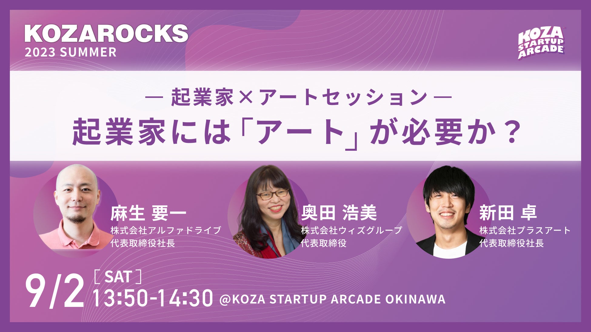 KOZAROCKS 2023 Summerのメインステージでは、アーティストでもある起業家3名が登壇。起業家には「アート」が必要か?というテーマで、起業家とアートの関係性を語ります。Lagoonステージにて、13:50より開始予定。