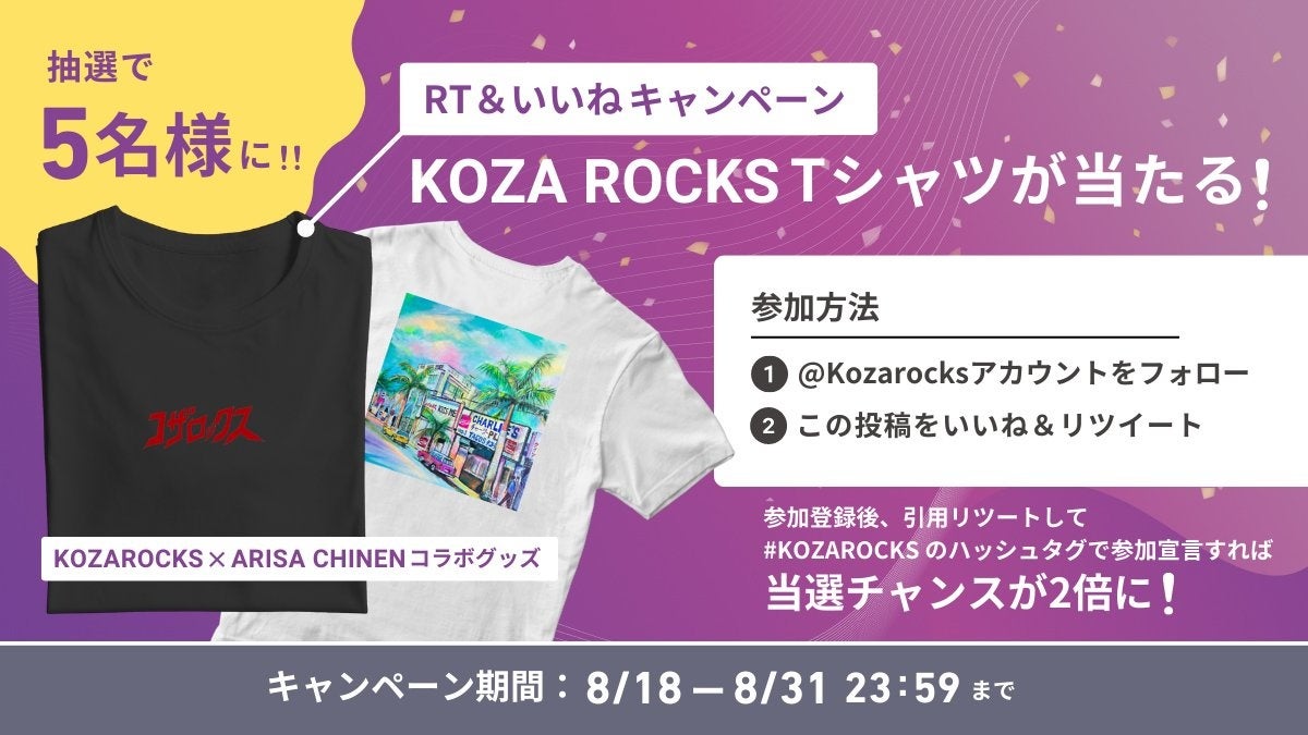コザスタートアップ商店街のXアカウント(https://twitter.com/Kozarocks)をフォローし、対象の投稿をいいね&RT(リポスト)した方の中から抽選で5名にTシャツをプレゼントするキャンペーンを開催中。